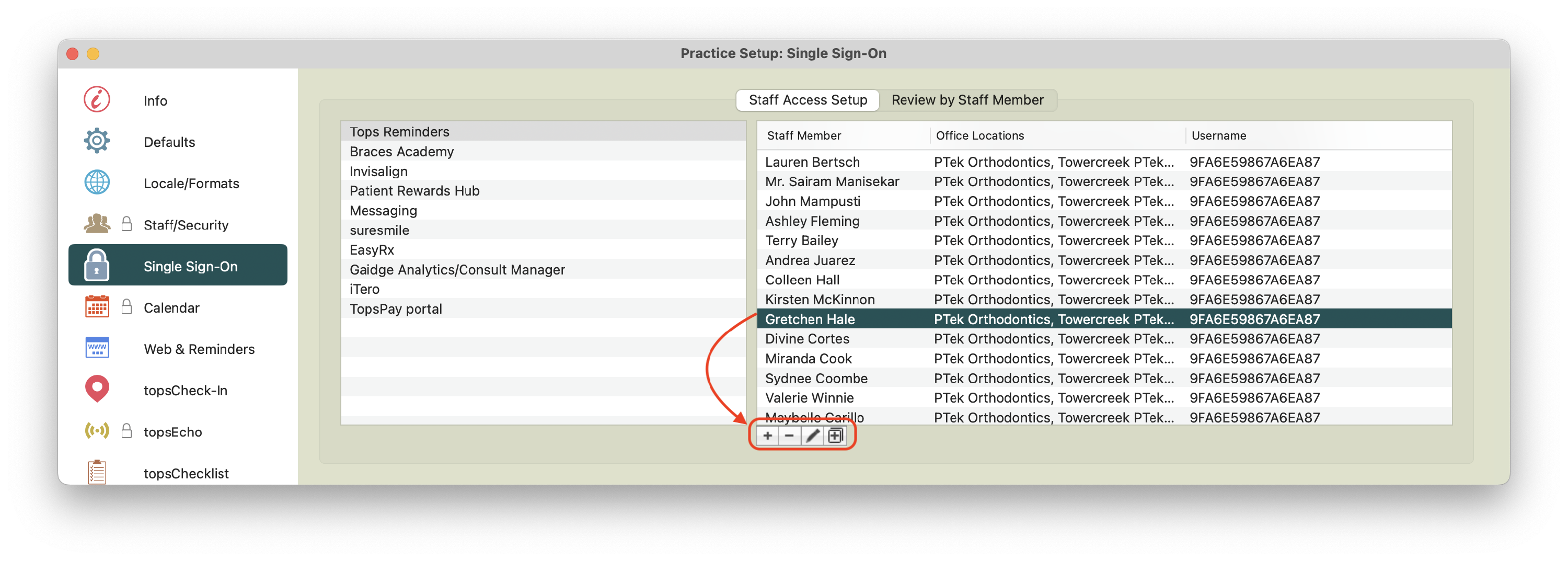 - To remove the staff member, click the minus symbol to remove the staff member's Single Sign-on entry.
