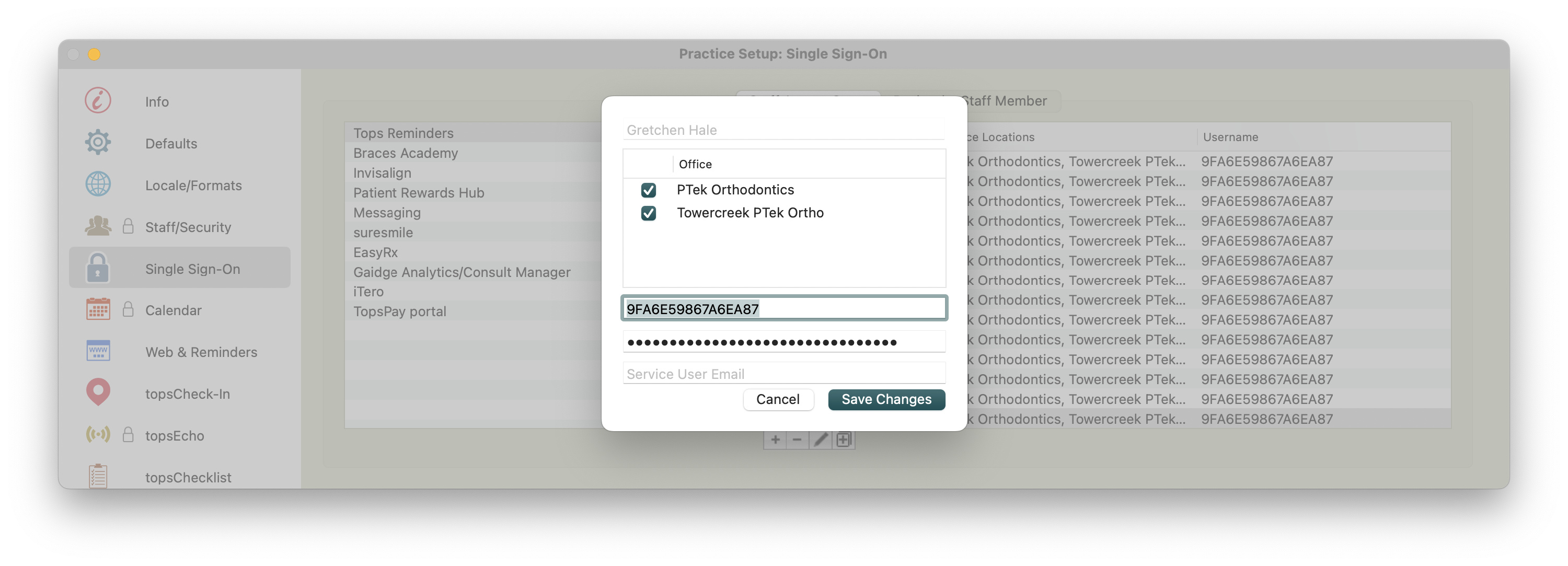 - Select the service for which you wish to modify or remove staff member's credentials, such as Tops Reminders, Braces Academy, Invisalign, Patient Rewards Hub, Messaging, suresmile, EasyRx, Gaidge Analytics, iTero, or TopsPay portal.