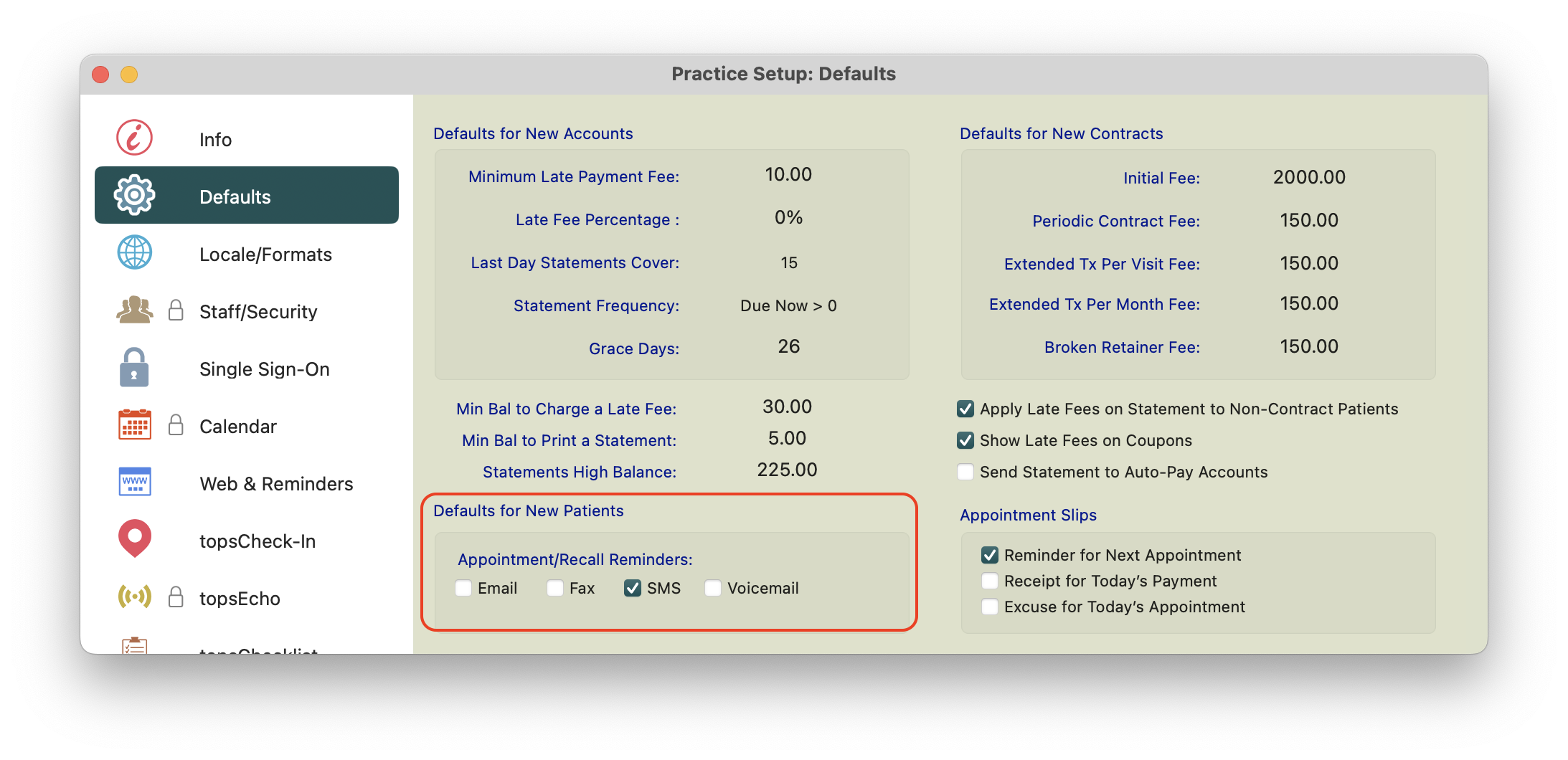 - In the Appointment/Recall Reminders section, select the checkbox(es) for the reminder method(s) you want to use.