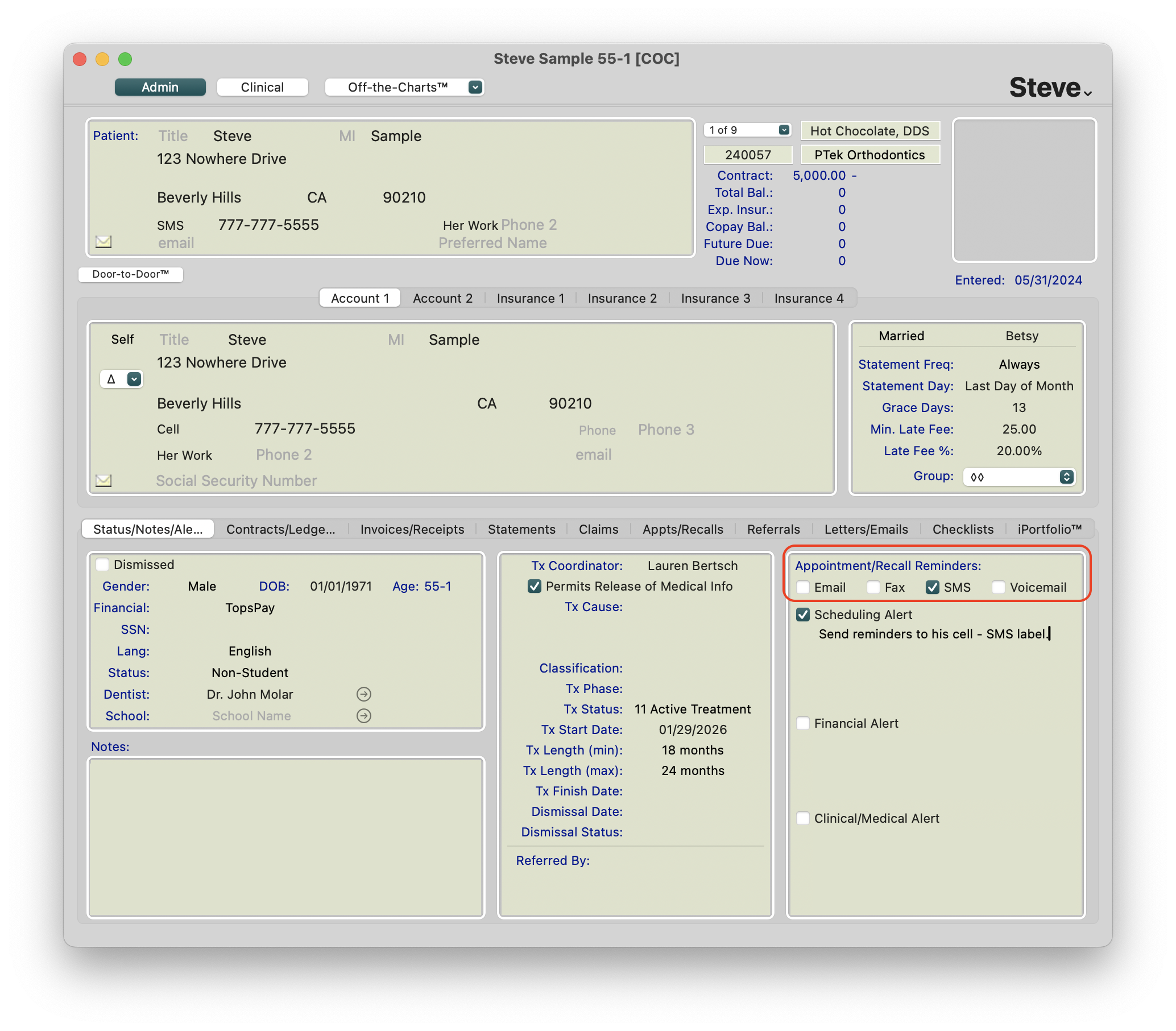 Appointment and recall reminders can be sent to patients by email, fax, SMS, or voicemail. You can set default reminder methods for new patients, and also manage reminder preferences for individual patients.