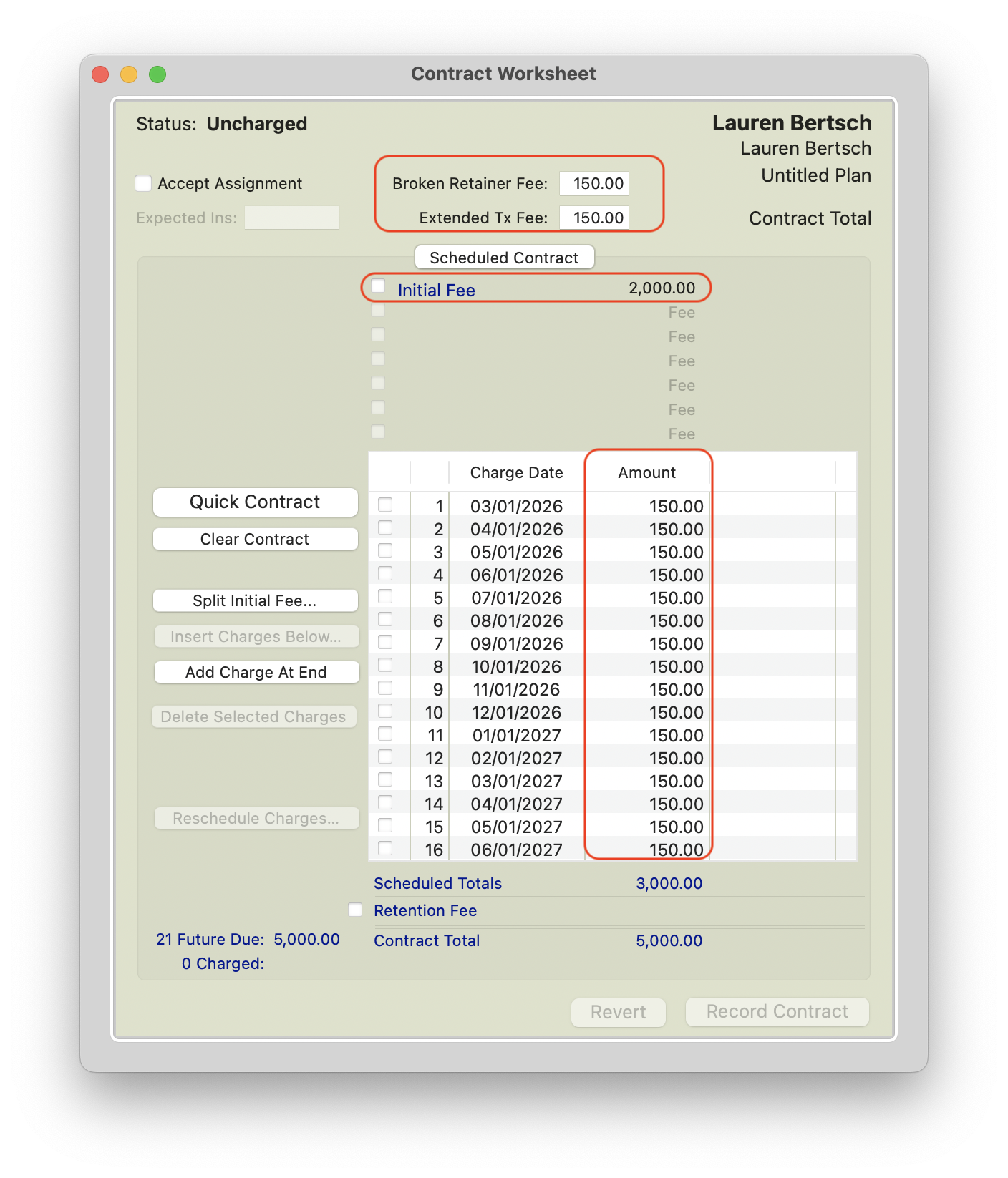 Other fee that can auto-populate or serve as a reference that can be updated to auto-populate in your new contracts are your periodic contract fee that populated for your monthly charges; your typical extended treatment per visit fee, your extended tx per month fee and your broken retainer fee. The latter three are purely for reference but will auto-populate in your contract worksheet.