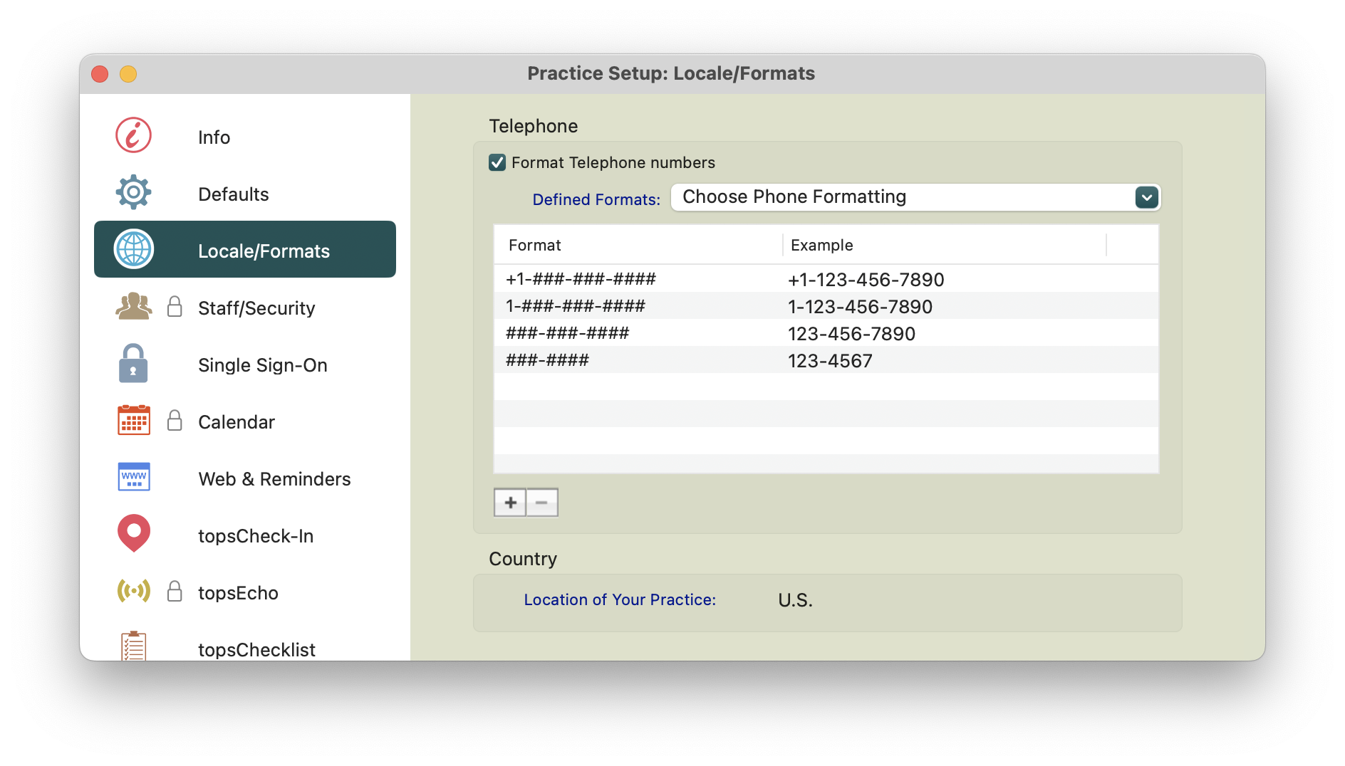 You can customize telephone formatting and specify the location of your practice for date and time formatting within Tops.