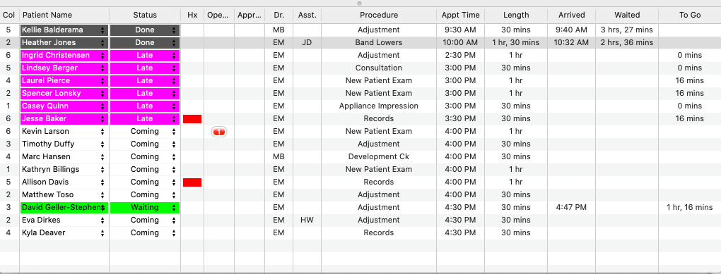 Indicates how many patients are Coming, Late, Waiting, Seated, and Done.
