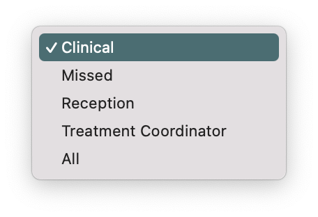 - The display options for the Patient Flow window are available within the dropdown menu in the upper left. (i.e. Clinical, Missed, Reception, Treatment Coordinator, All.)