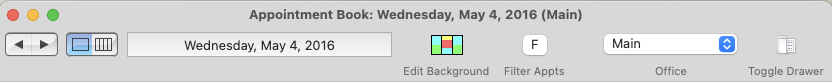 The upper part of the Appointment Book allows you to navigate through your schedule and to select other options. You can customize their Appointment Book display with the filter and function options in the header.