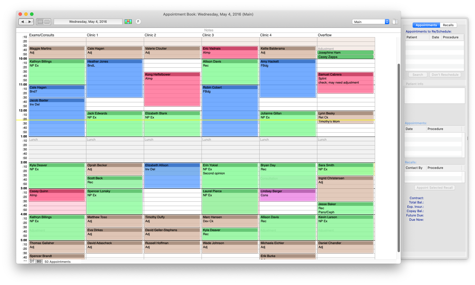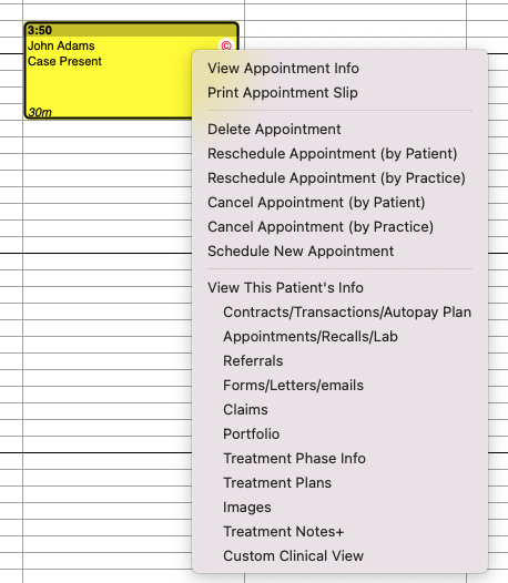 - Schedule Options Double-click an appointment to access details of the appointment - the Appointment Info window. Right-click an appointment for a contexual list of options. e.g. Reschedule Appointment, Schedule New Appointment, View This Patient's Info.