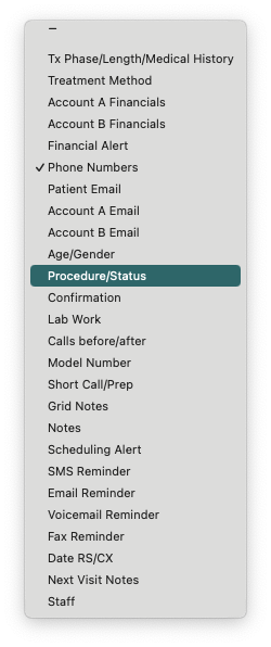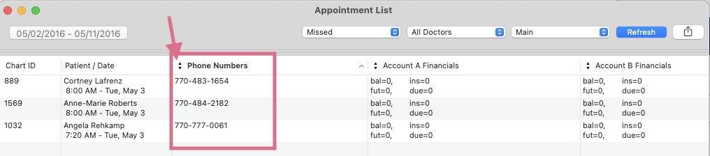 The information displayed in the columns can be updated. Click the arrows icon within the column header to view a list of options. We recommend selecting Phone Numbers to call your patients for rescheduling their missed appointment.