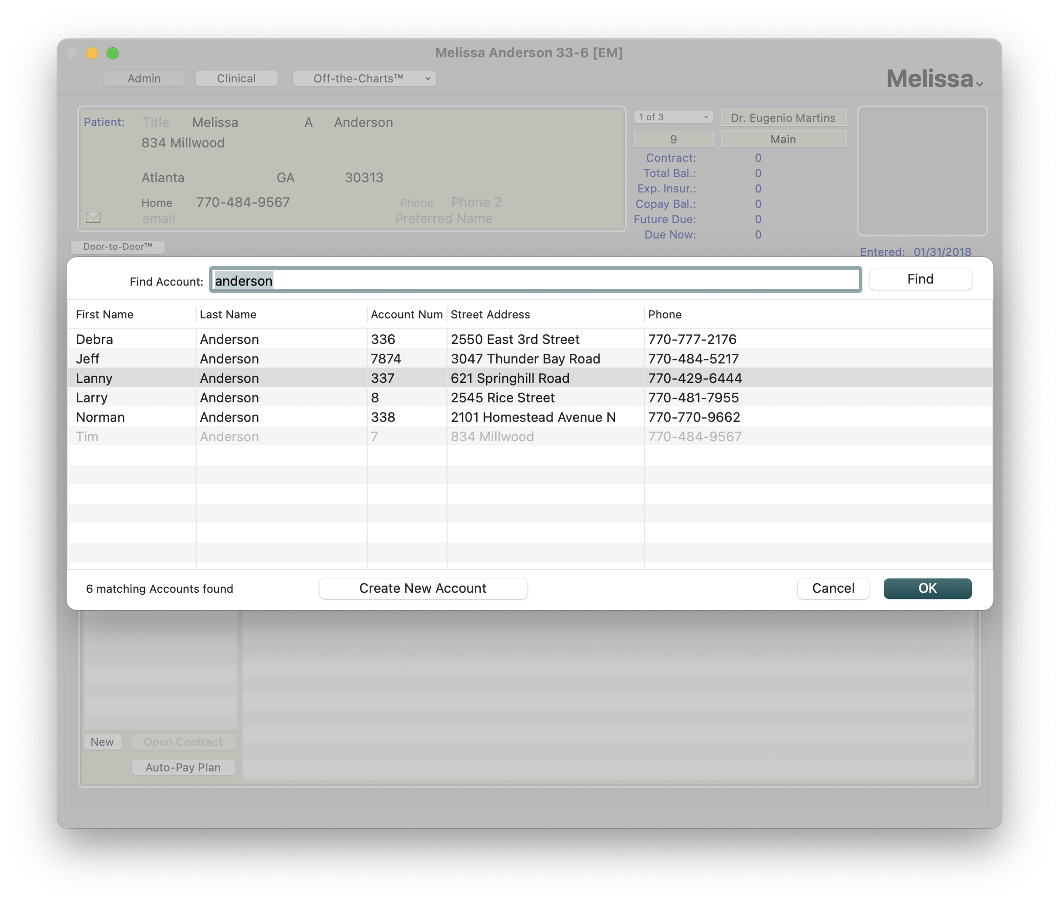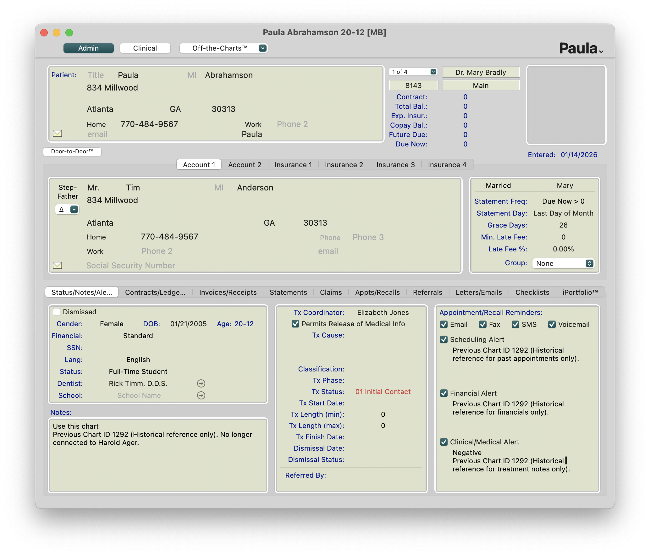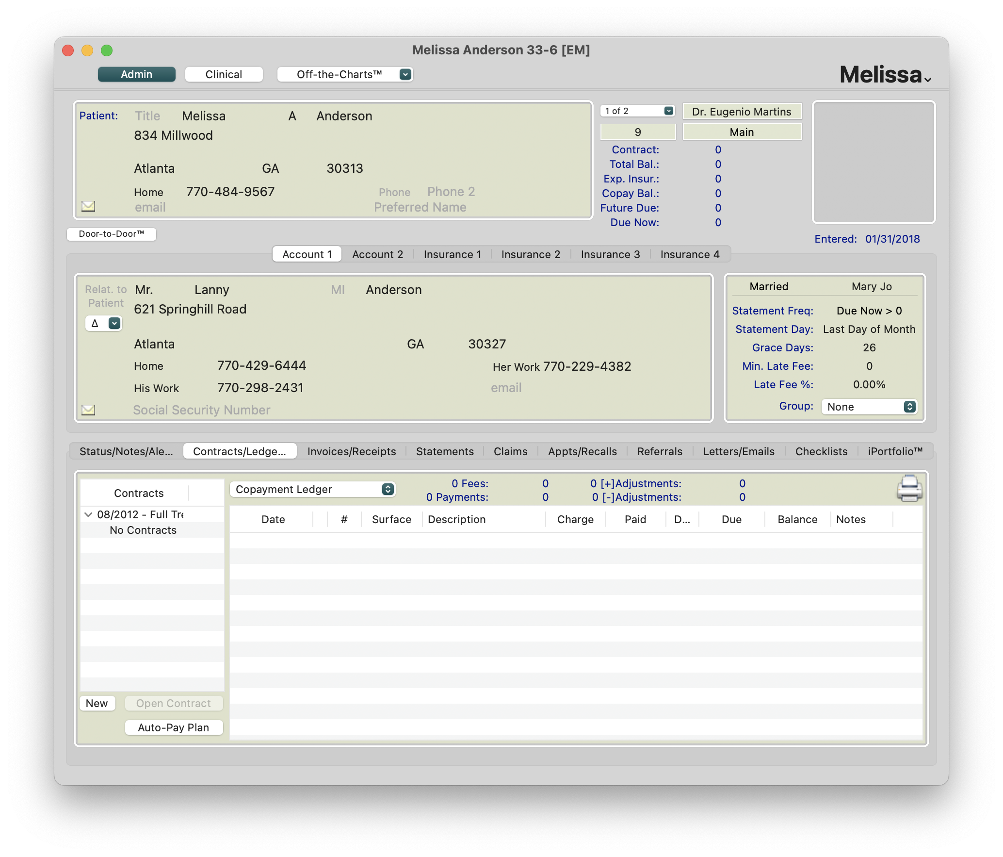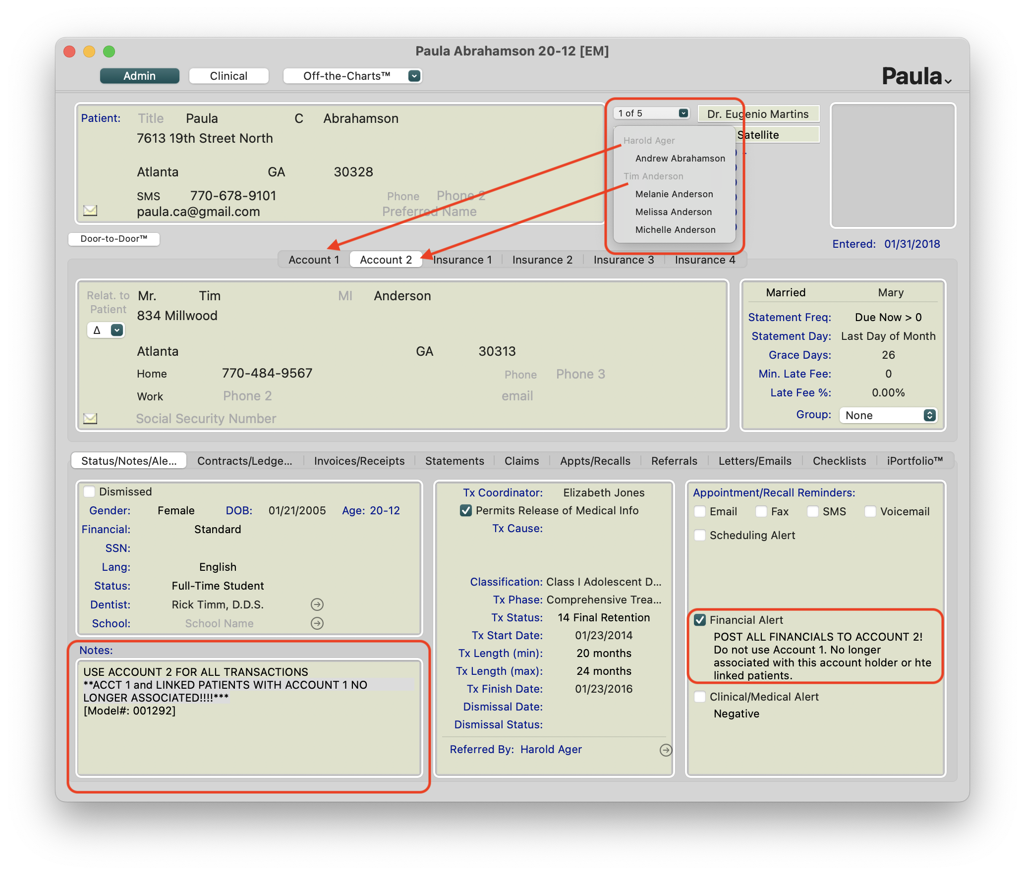 - Account 2 can now be used for posting financials, creating an auto-pay plan and eliminates the need to create a new, duplicate patient chart
