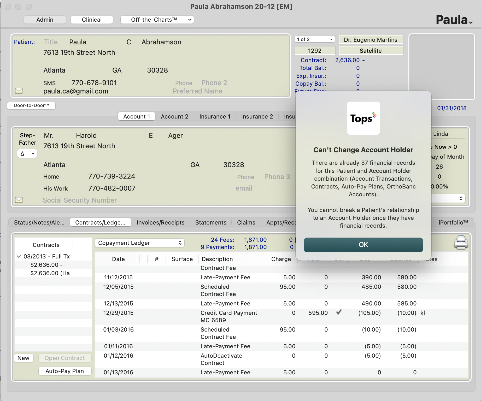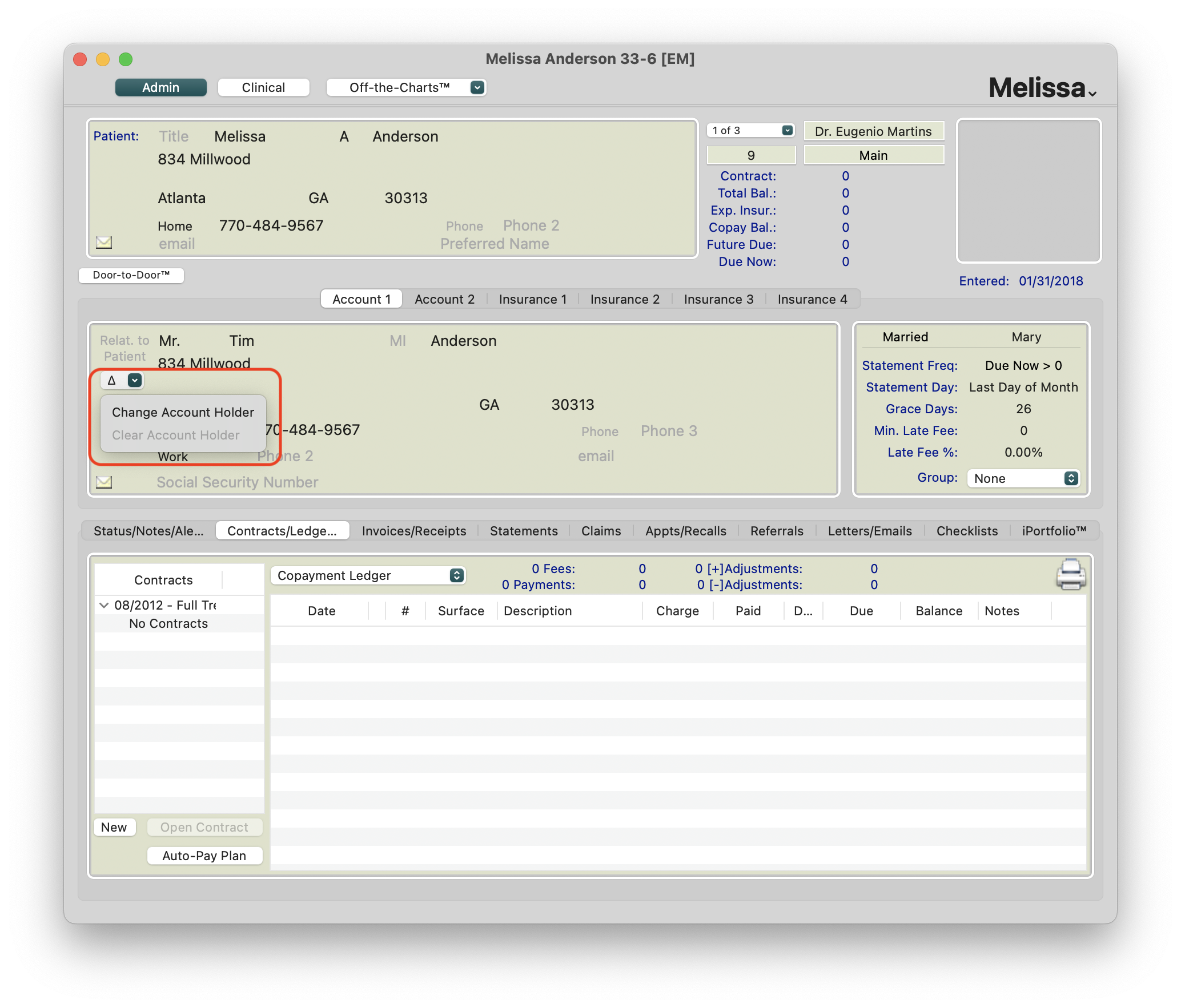 Whether a contract has been opened or recorded, charges have posted or you have collected and posted a payment, financials are now part of the patient's record with the specific account holder and the account holder cannot be changed. You are unable to change the account holder because there is now historical, financial information linked.