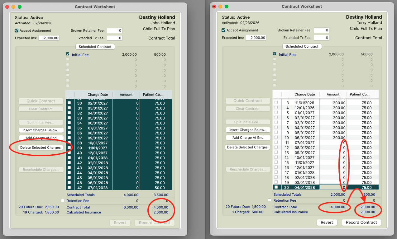 - Reduce the existing $6000 contract amount for Account 1 to a Total Contract amount of $4000. Do this by editing the number of Copay Charges (screenshot on the left) as well as the Amount (Insurance) Charges (screenshot on the right) to balance the out-of-pocket charges for client and original expected insurance.