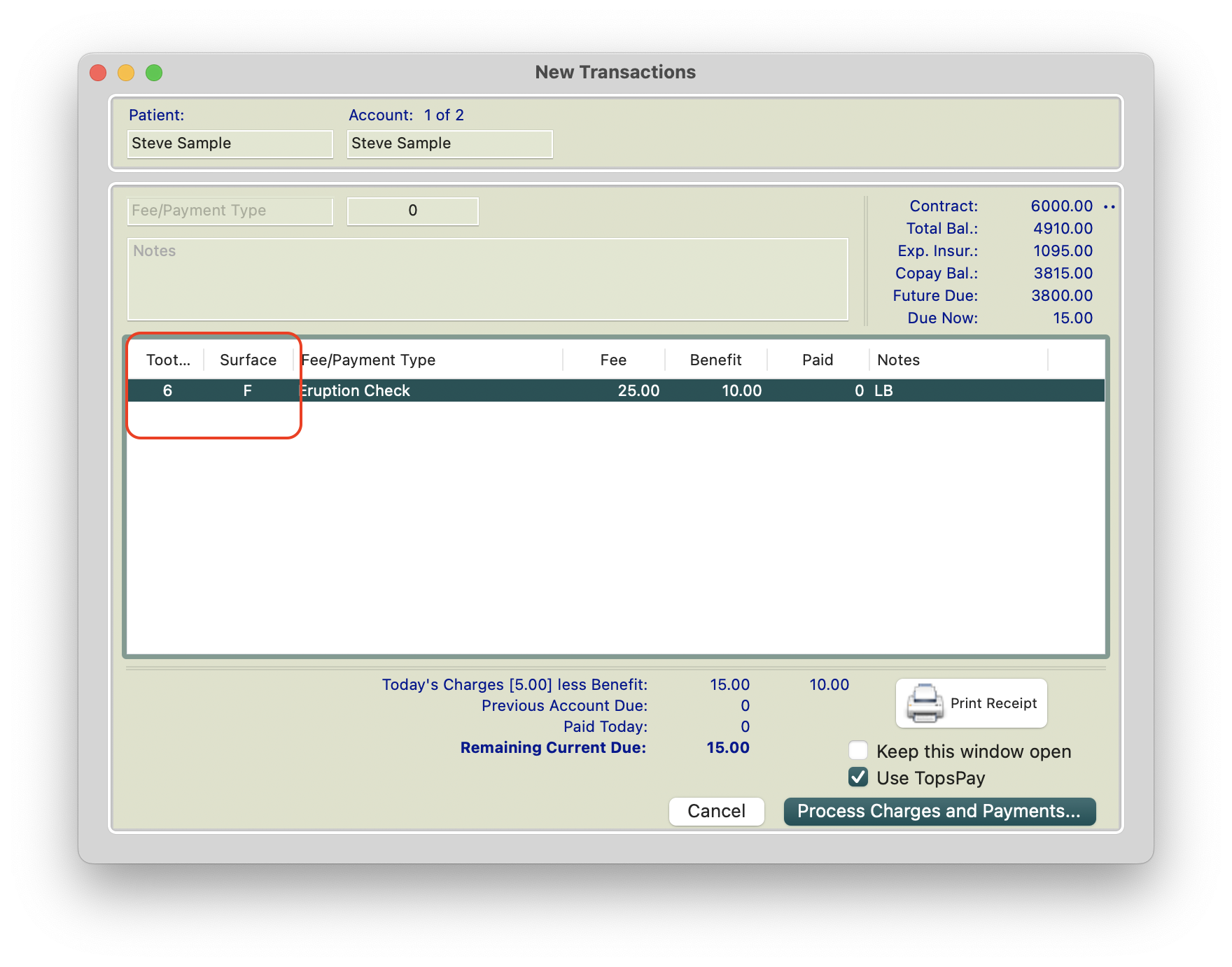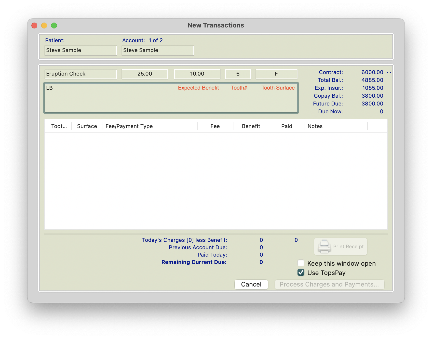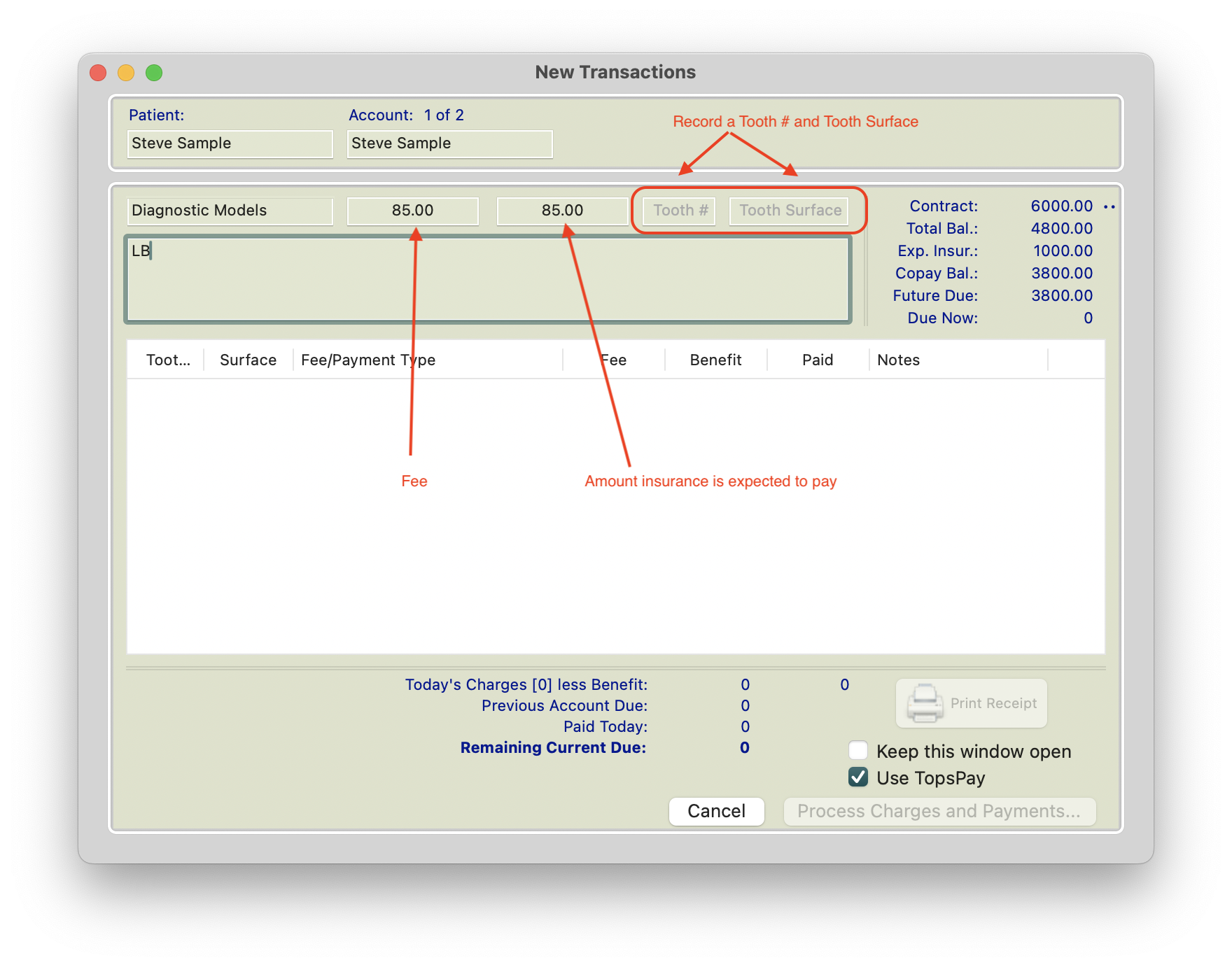 This version of the transaction window does not record Tooth Number, Surface or a portion of the fee as a benefit (expected insurance payment). For more information on a modified version of the transaction window, please read the lower portion of this page.