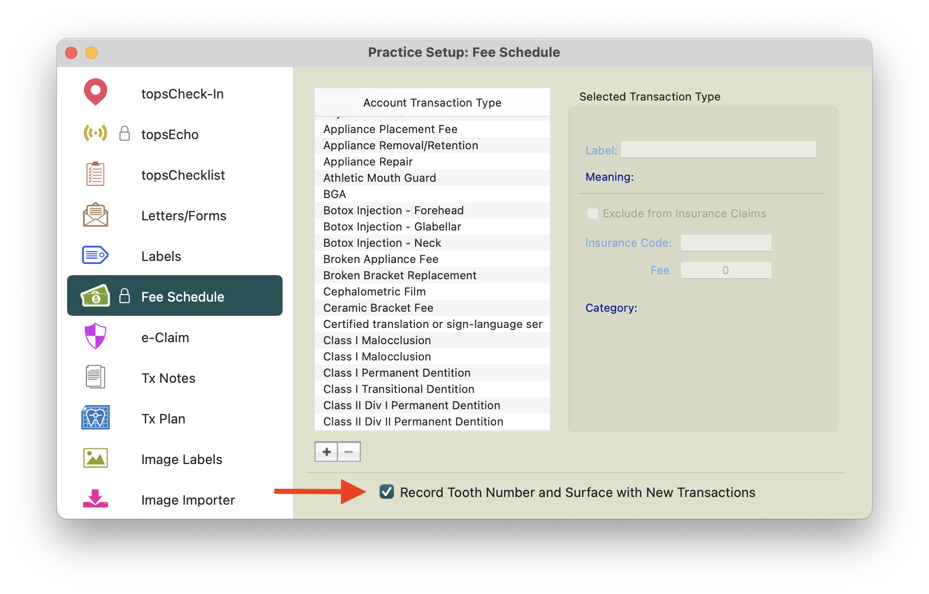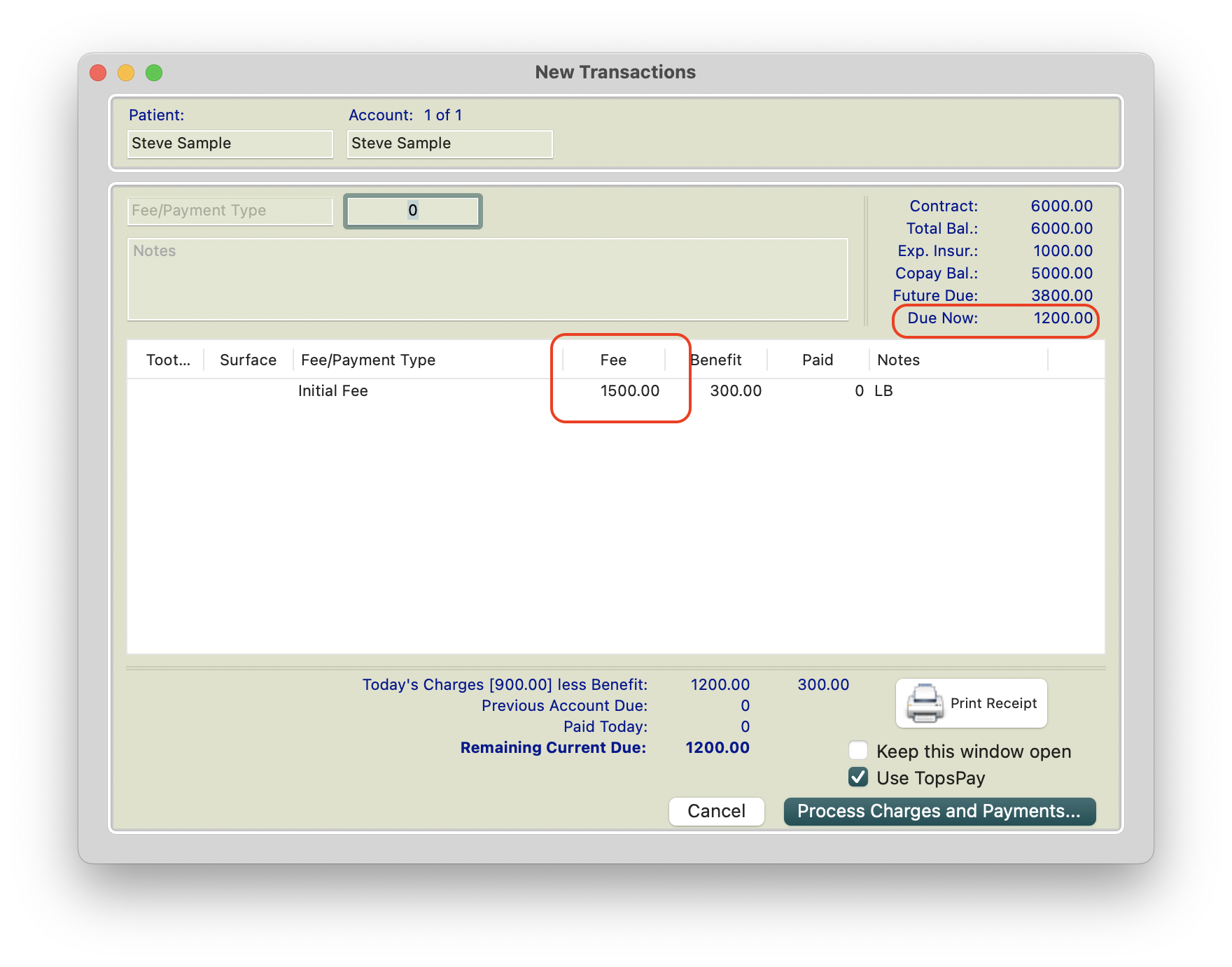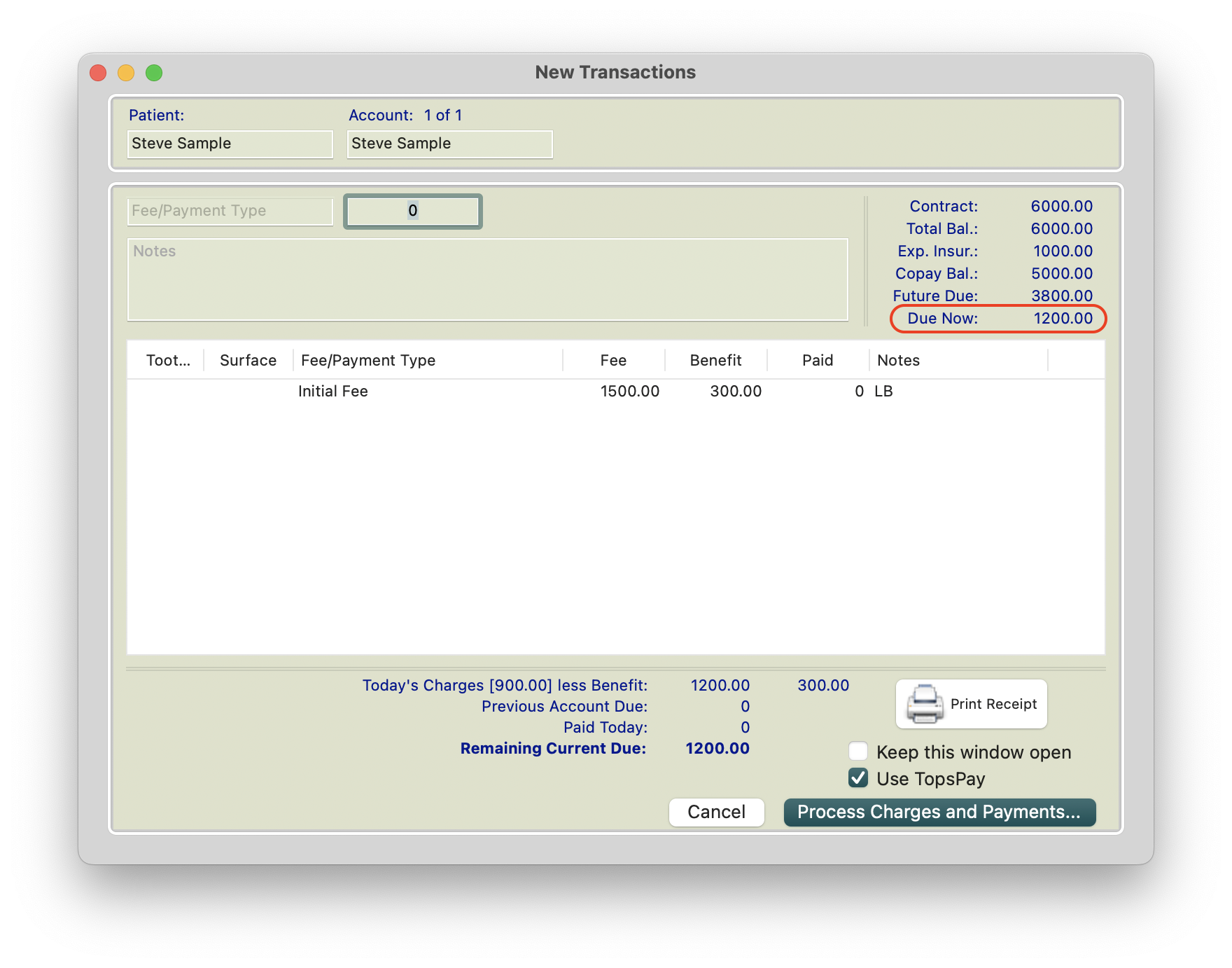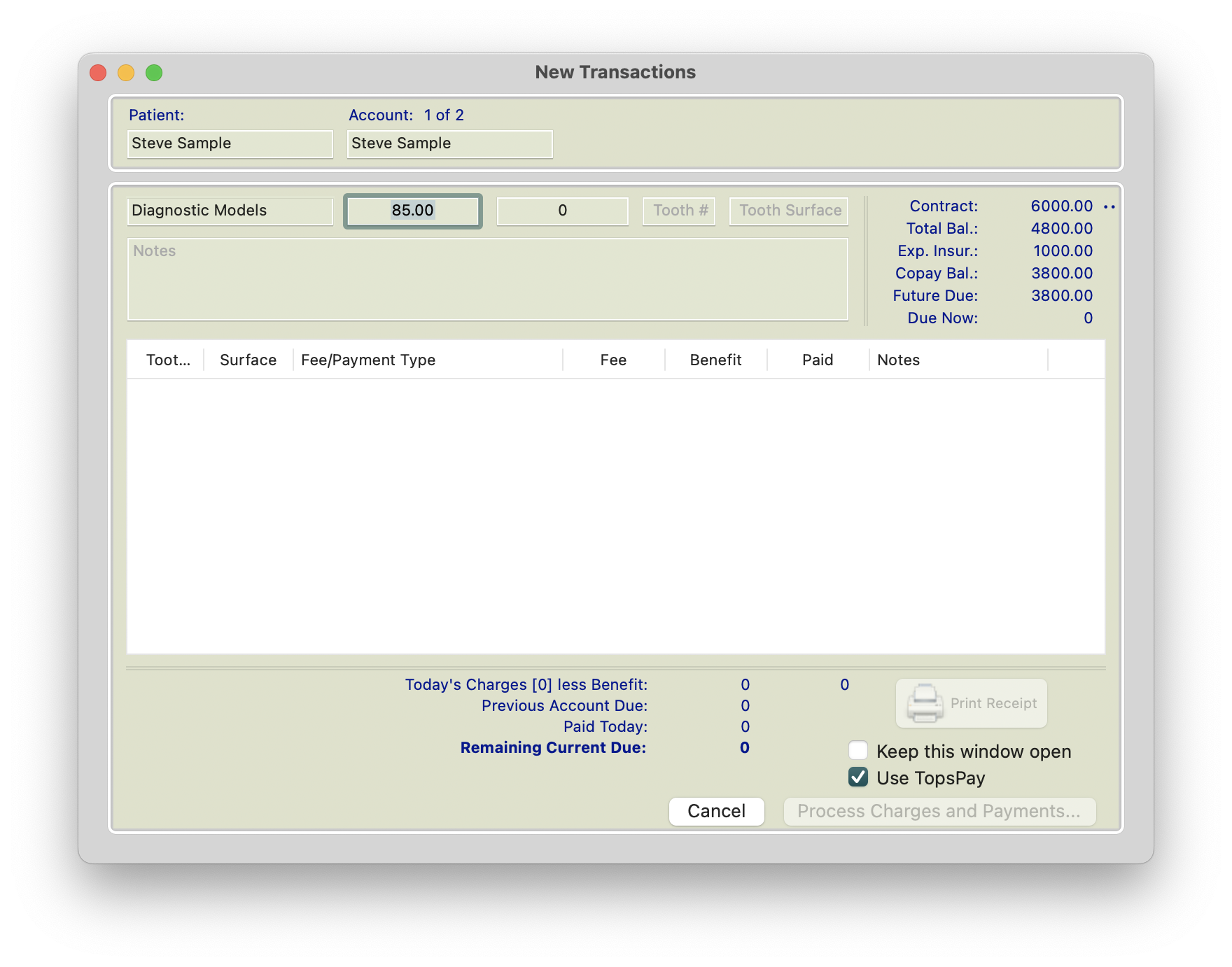 This version of the transaction window does not record Tooth Number, Surface or a portion of the fee as a benefit (expected insurance payment). For more information on a modified version of the transaction window, please read the lower portion of this page.