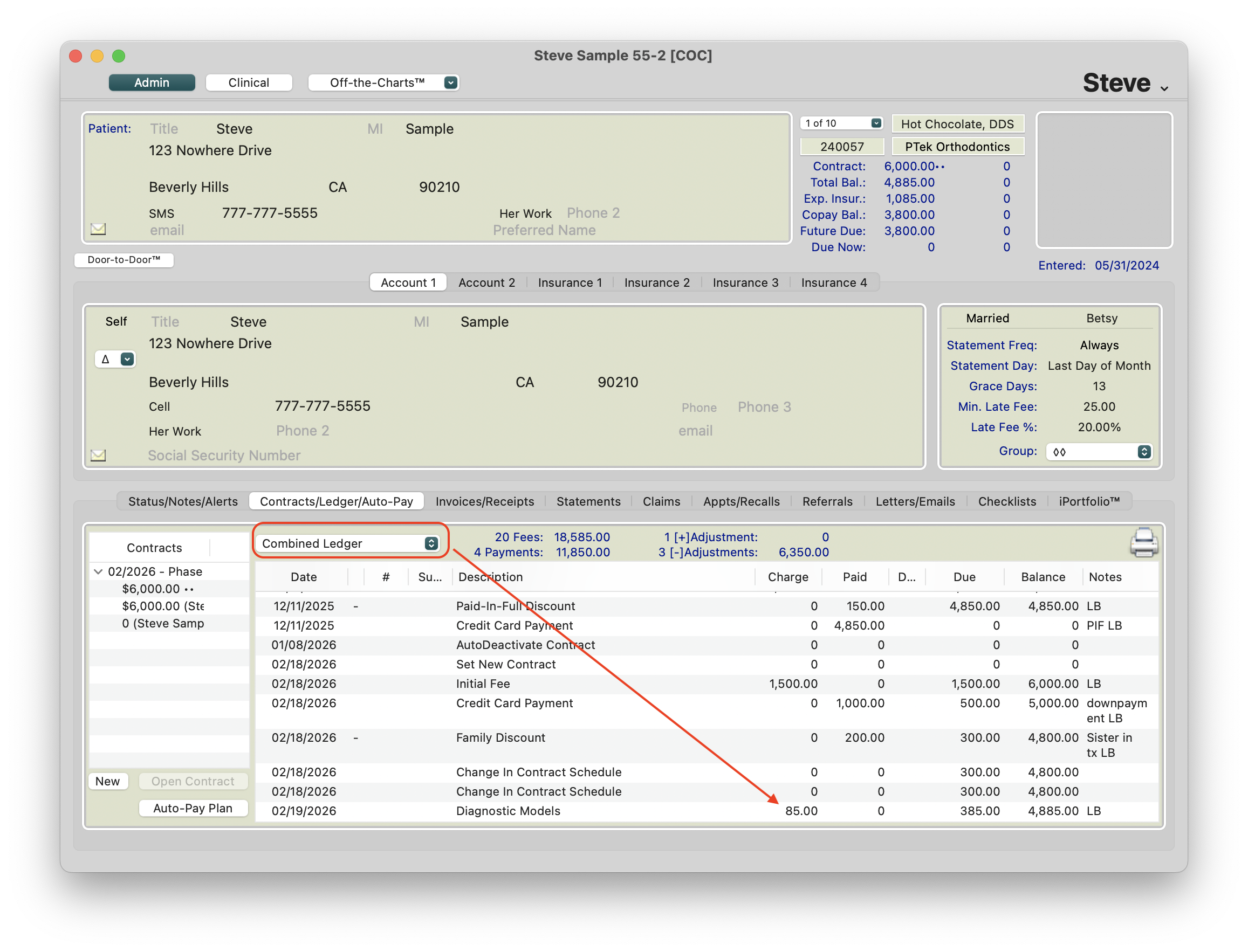 - When the initial fee is charged out, the $1500.00 is posted to the patient's financials as represented by the Combined Ledger. Of the $6000 recorded as production, $1500 is being charged out with the initial fee.