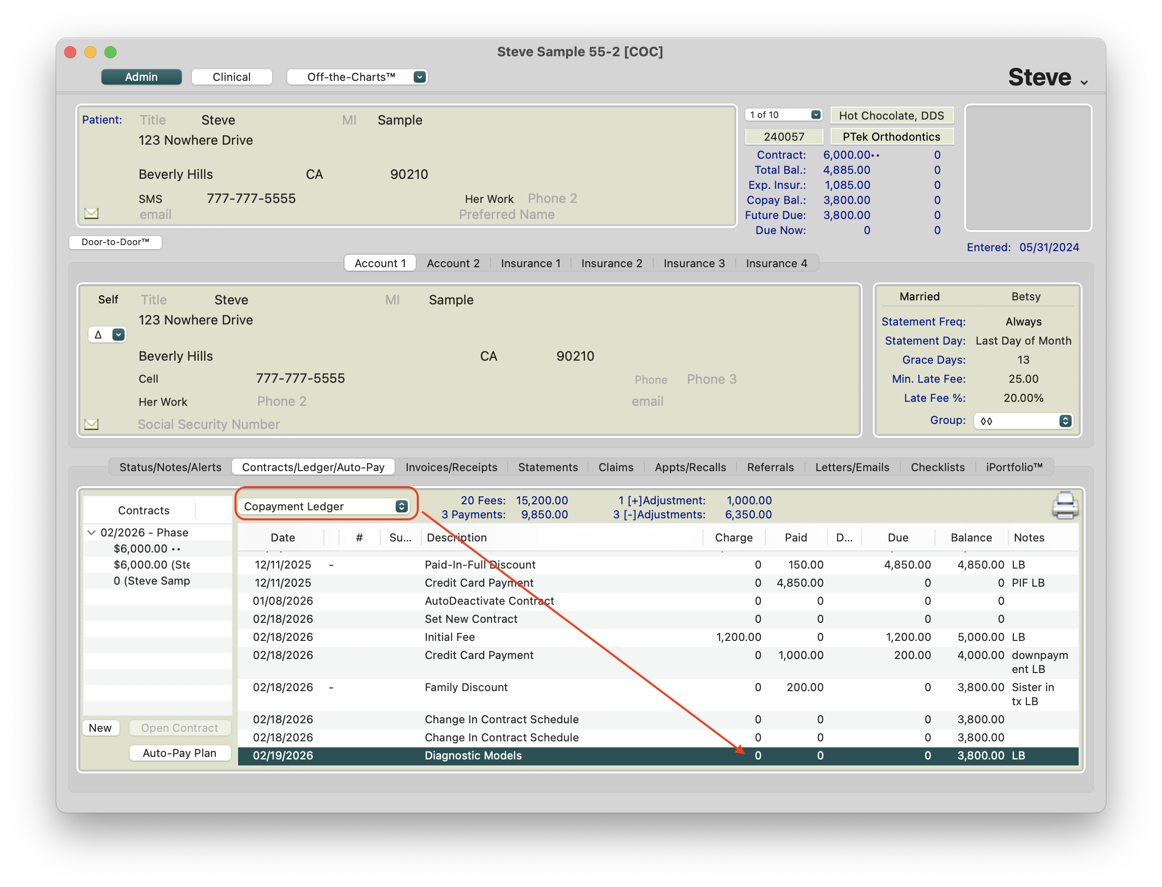 - When viewing the initial fee from the Copayment ledger, $1200 of the patient's $5000 responsibility posted to the patient's ledger. Remember, the additional $1000 of the contract is being covered by the insurance and not included as part of the patient copayment balance.