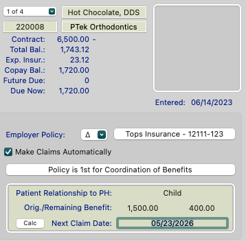 For example, if the claim frequency is set to Quarterly and the next claim date is 4/1/2026, Tops will review the patient’s ledger for any qualifying transactions posted within the previous quarter and generate a claim on 4/1/2026 representing those transactions and the amounts. These transactions may include automatically posted contract charges, such as scheduled monthly contract amounts, as well as manually posted transactions that have been marked to appear on a claim.