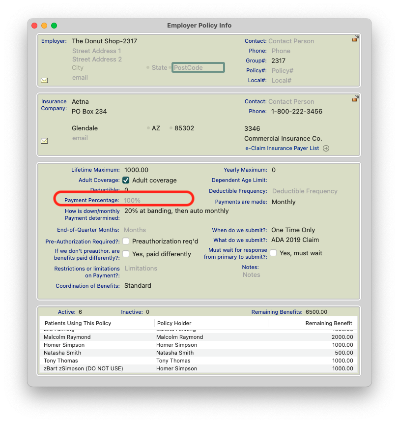 For example, if a patient has 400 dollars in their Remaining Benefit of the policy; a 50 % payment calculation represented in their employer policy; and five open claims for $200 dollars each, the system will apply the remaining benefit starting with the oldest dated claims. Each claim would have a possible payment value of $100. The first four claims will reserve the full $400 dollars of the patient's Remaining Benefit, and the fifth, most recent claim will display a $0 possible payment value since no benefit remains available. The Remaining Benefit is not the Expected Insurance. The Remaining Benefit is the remaining benefit the patient has with the policy.