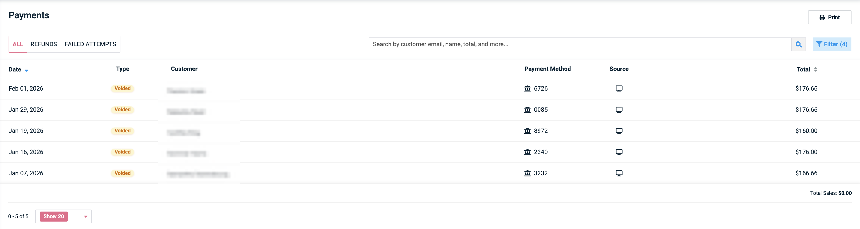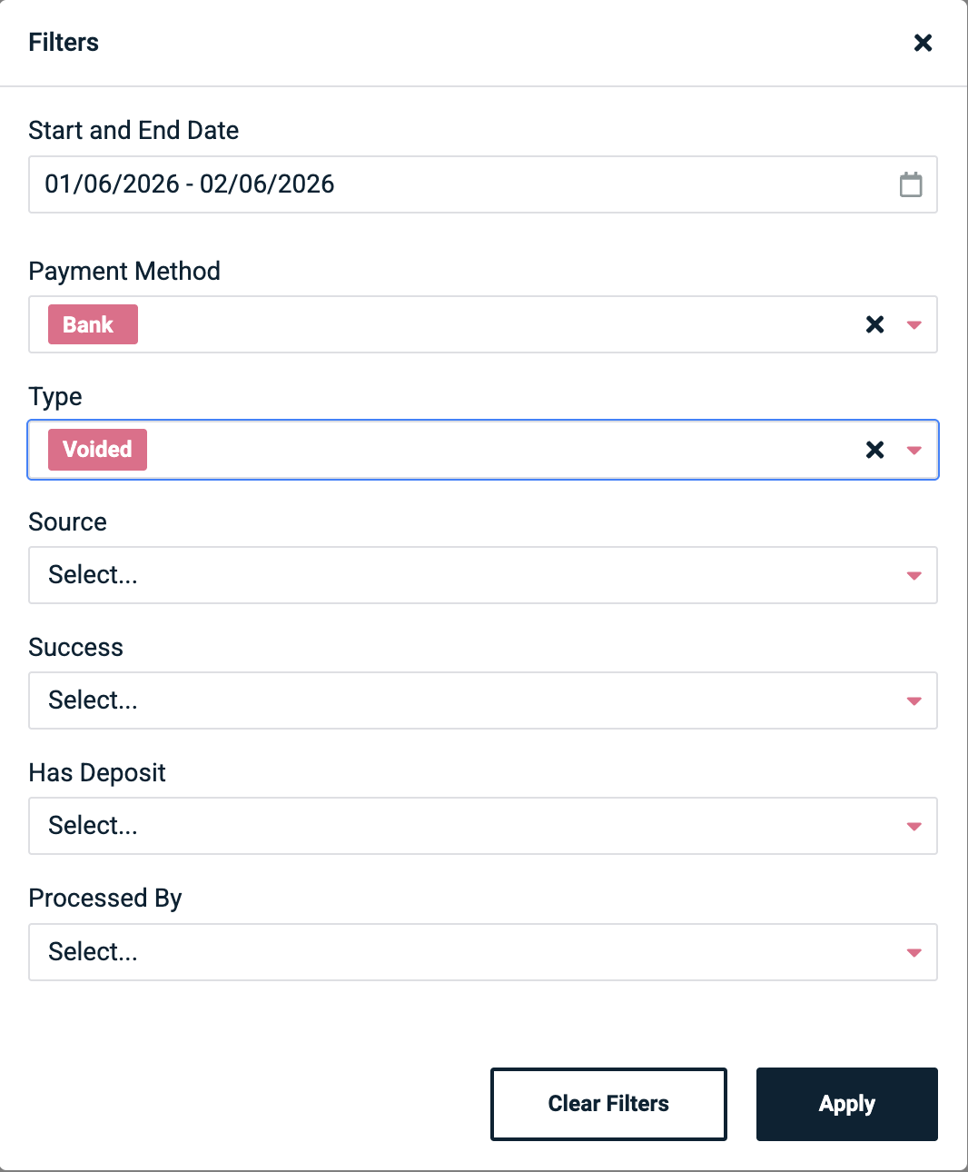 - Update the date range, the Payment Type to Bank and the Type to Voided. Click Apply.