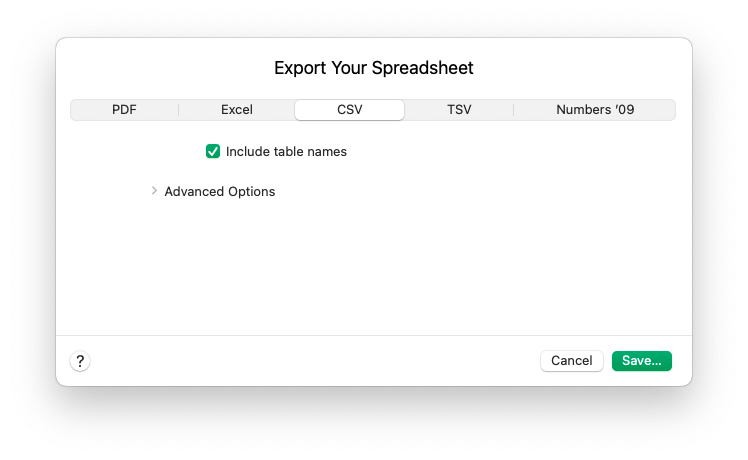 - In Numbers, go to File > Export to > CSV and follow the prompts to save the file.