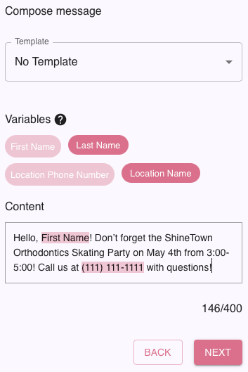 - You can use an existing Template, or simply type your message in the Content field. If desired, you can add variables to your message to make it more personal. Just click to add!