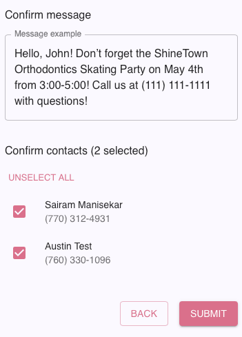 - A window will pop up with a preview of your broadcast and a list of recipients. Review and click Submit.