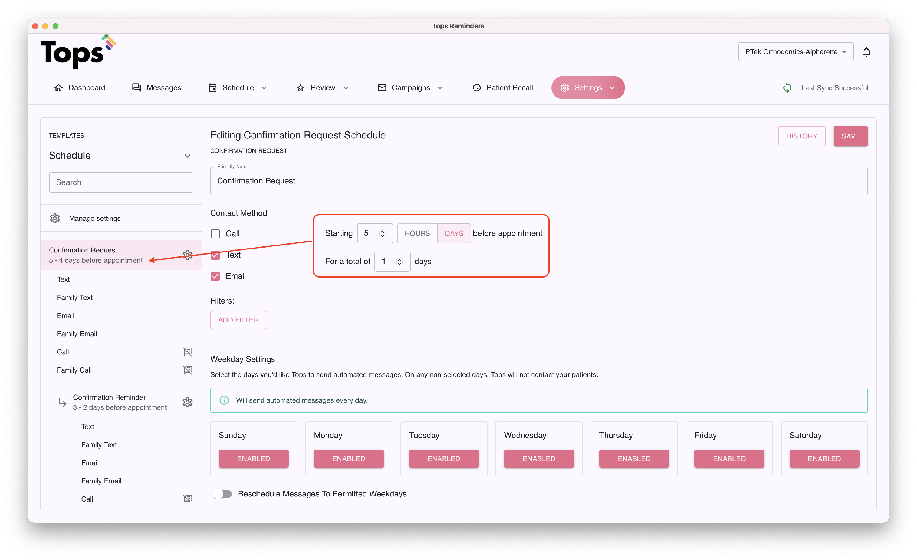 The “Starting X days before appointment” setting determines the earliest day an appointment becomes eligible to receive a confirmation request.