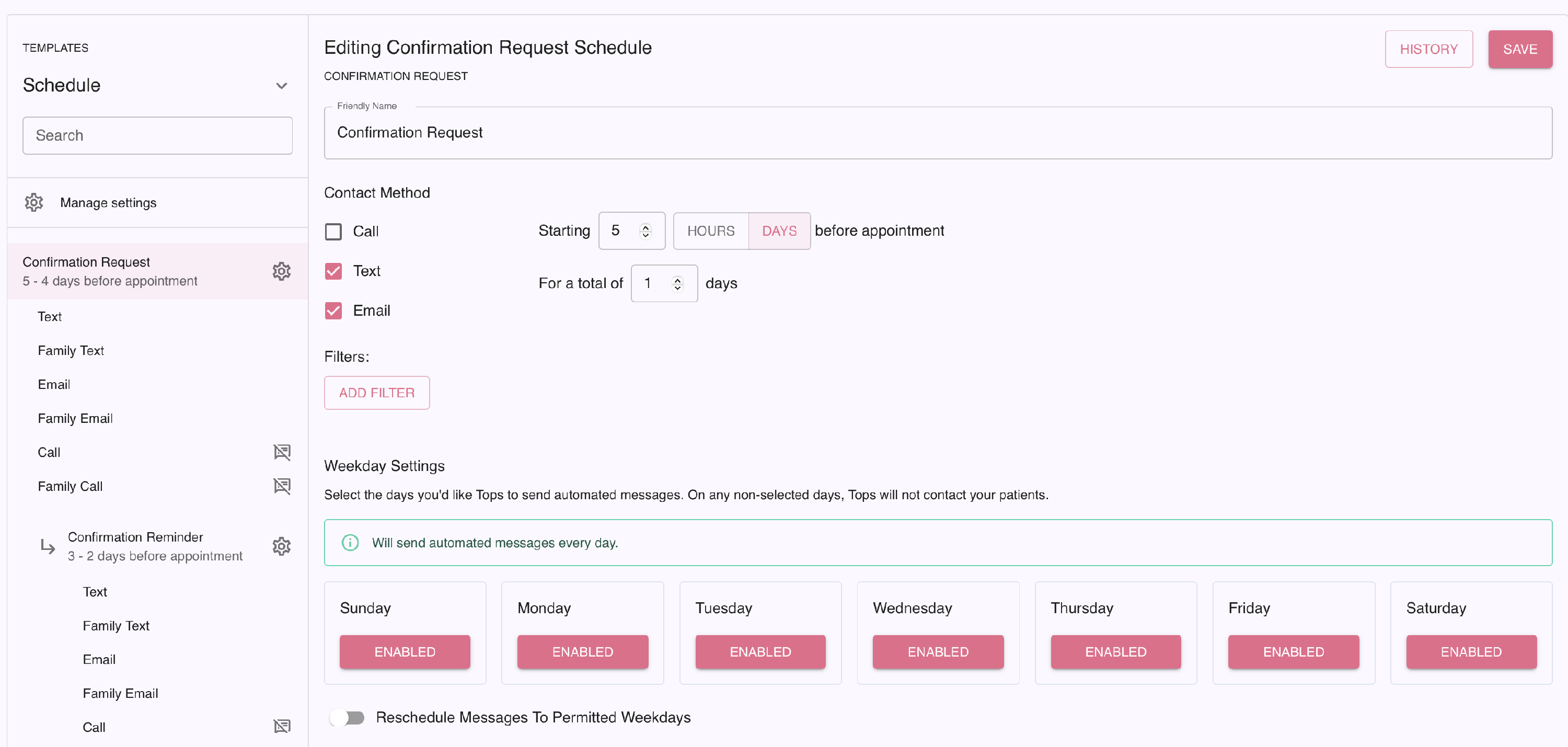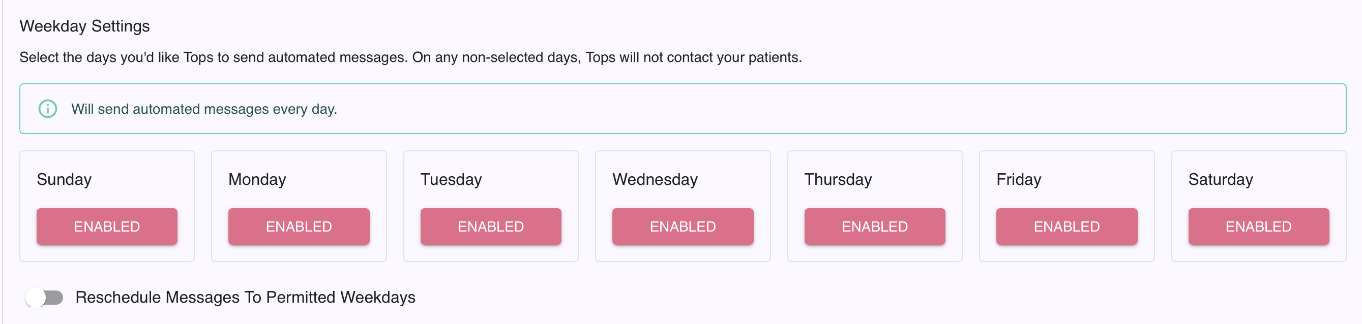 Unless you do not want messages to send to patients on certain days, we advise to have all days enabled.