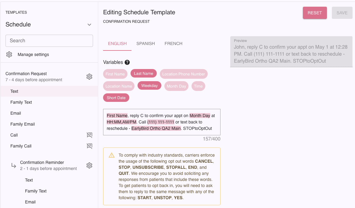 IMPORTANT: A Confirmation Reminder cannot be sent unless a Confirmation Request has already been sent. If a patient confirms after receiving her initial Confirmation Request, then she will not receive the Confirmation Reminder.