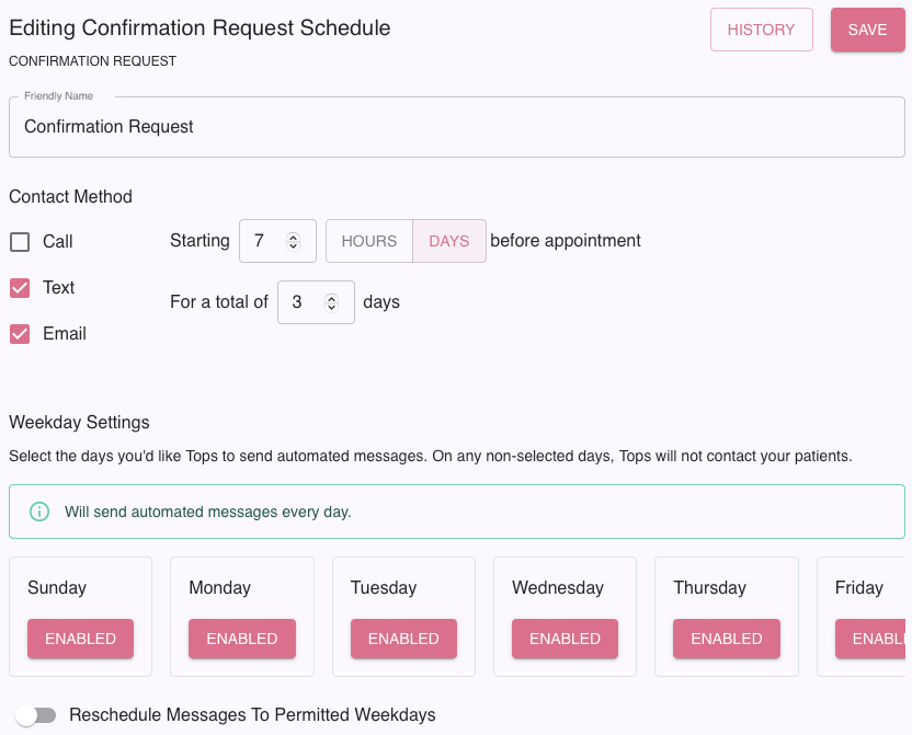 - Select Schedule. This will display the Confirmation Request and Confirmation Reminder settings you have in place.