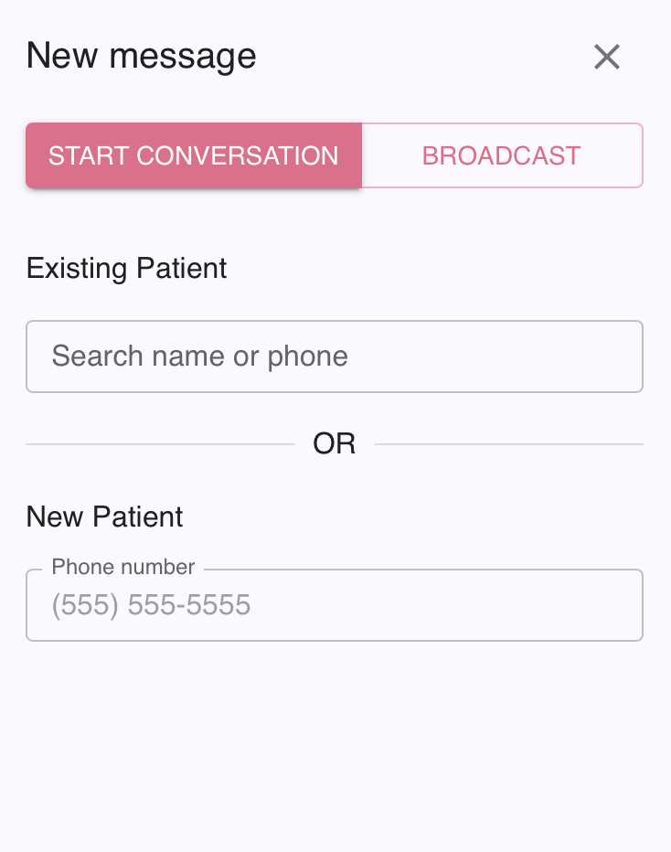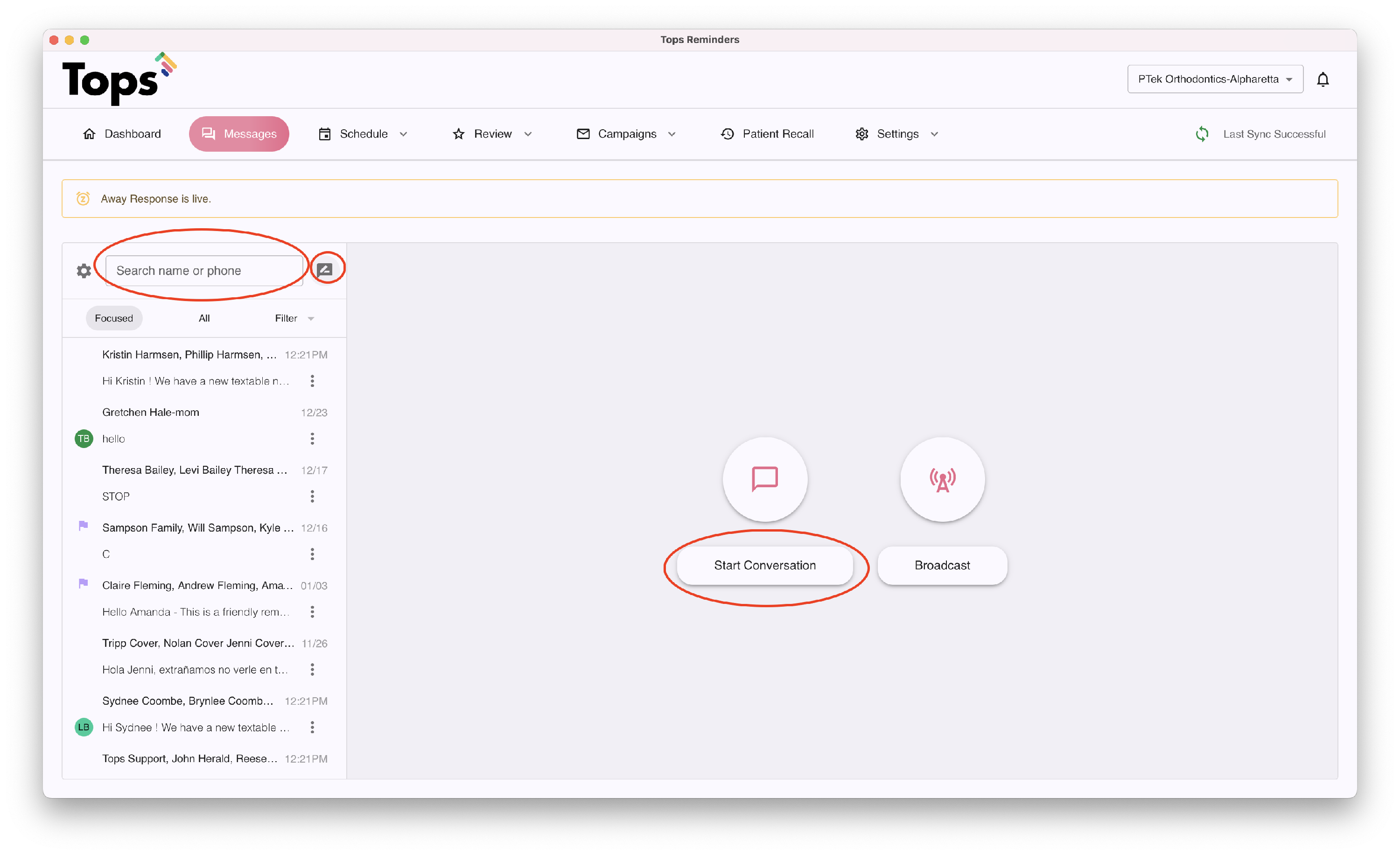 - From the Messages tab (or Product>Message) Search for the individual, click the New Message bubble or click Start a Conversation. You will have the option to add a new contact as well.