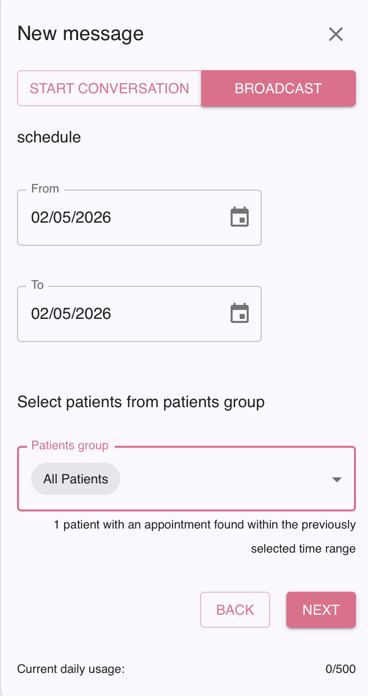 - In the All Patients dropdown, select the Patient Group(s) you wish to target. You may select up to five Patient Groups to receive the message.