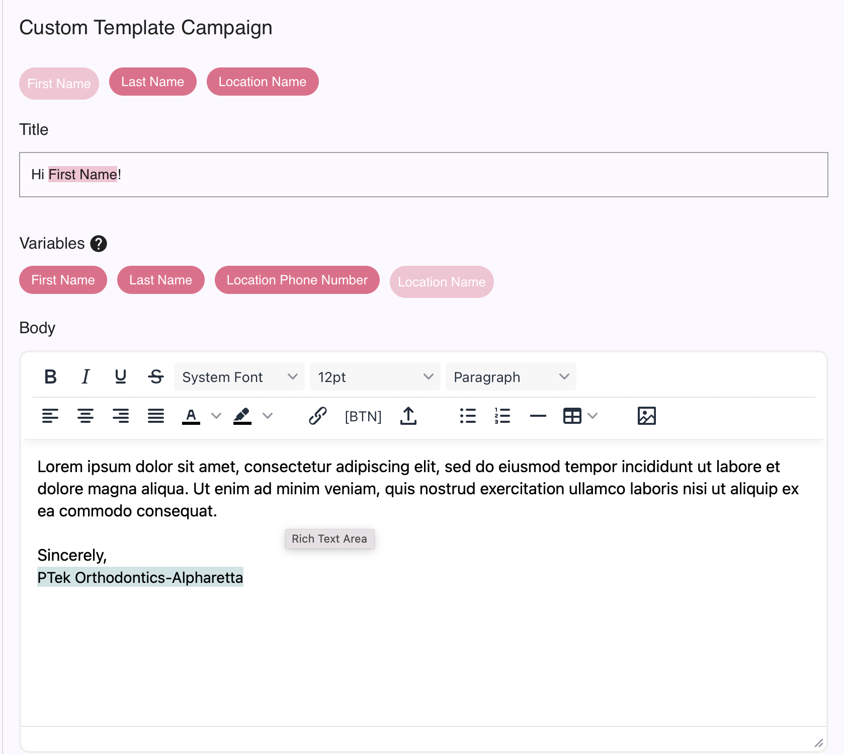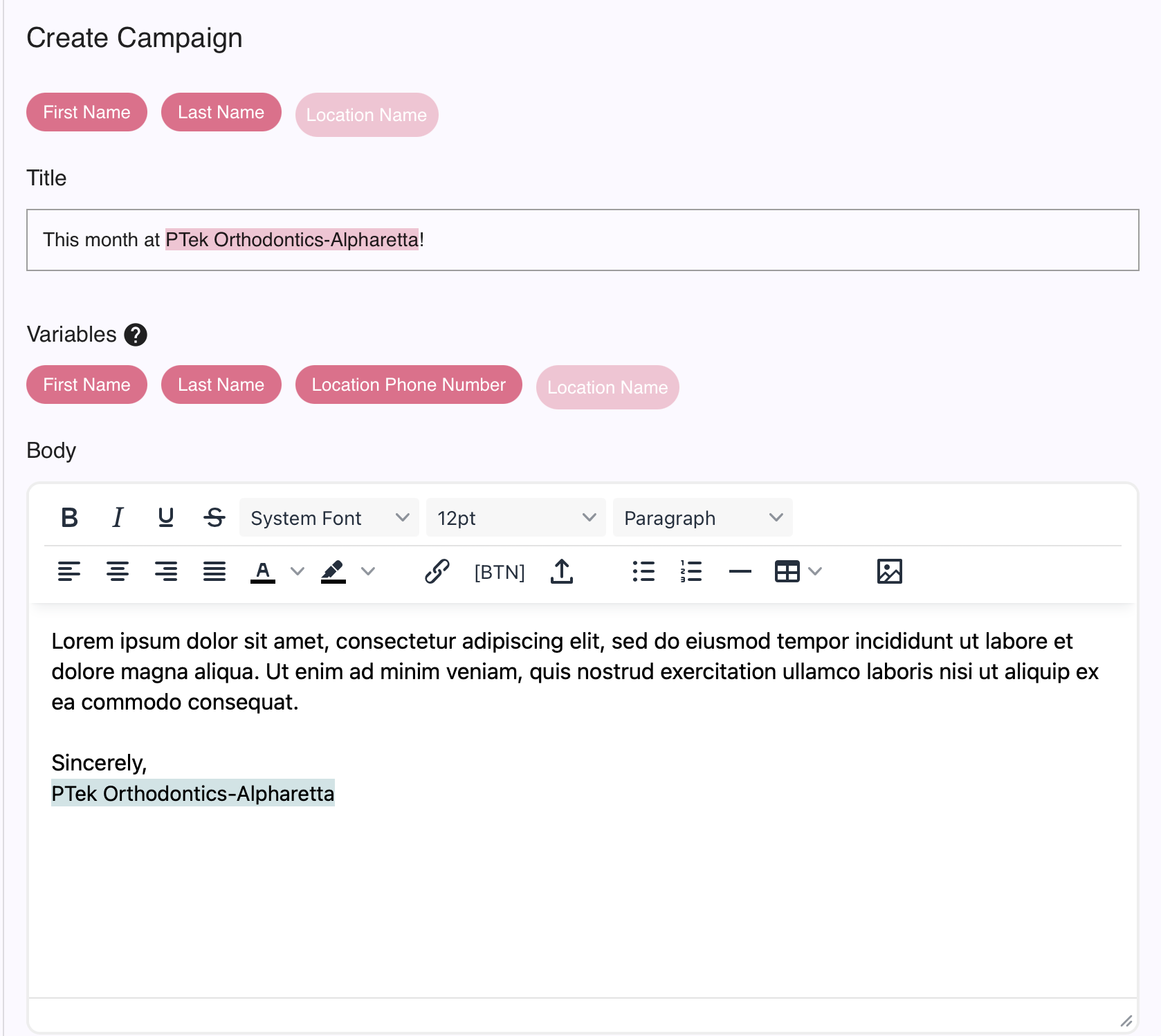 - Compose the Body of the email. Click the pink Variables to insert them into the message. Use the toolbar to change spacing, font and styles. Click the image icon to add a picture.