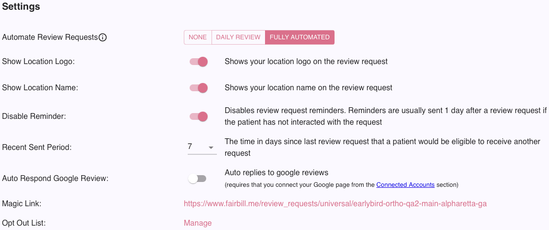 On this setting, your practice will receive a daily email with eligible review requests, and you can send at your leisure. No messages will be sent automatically.