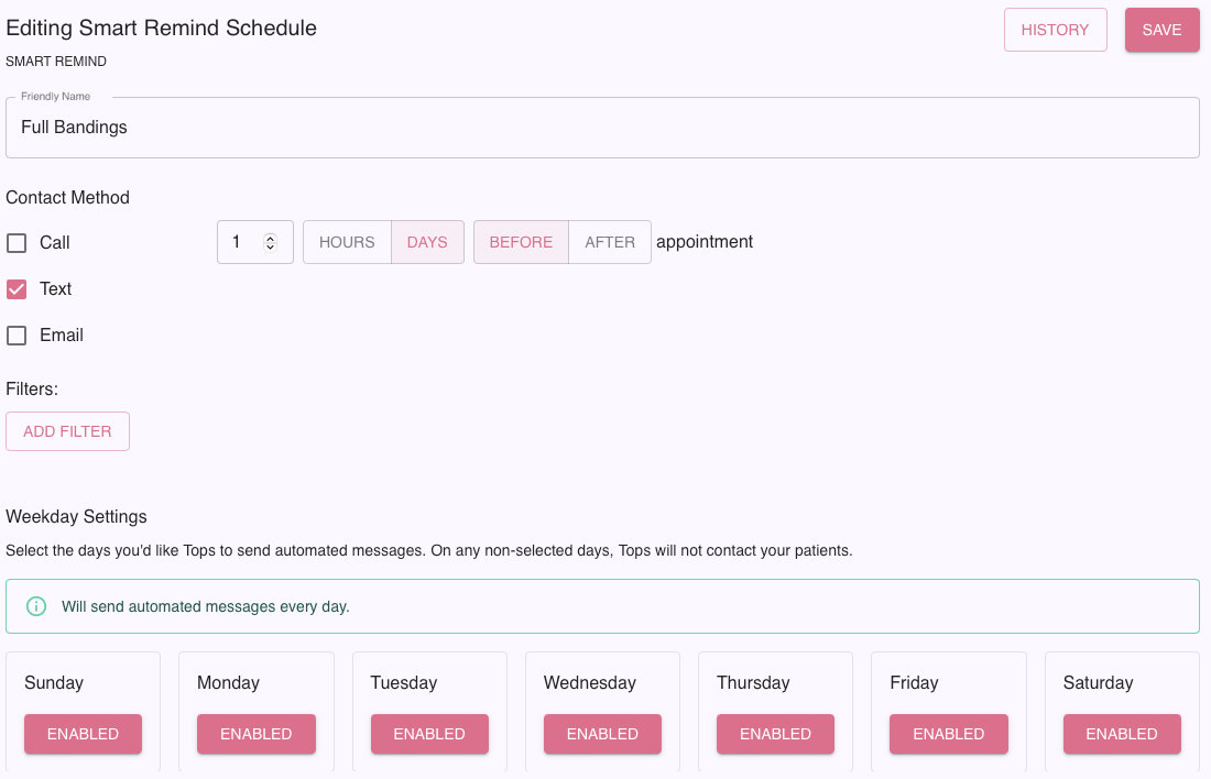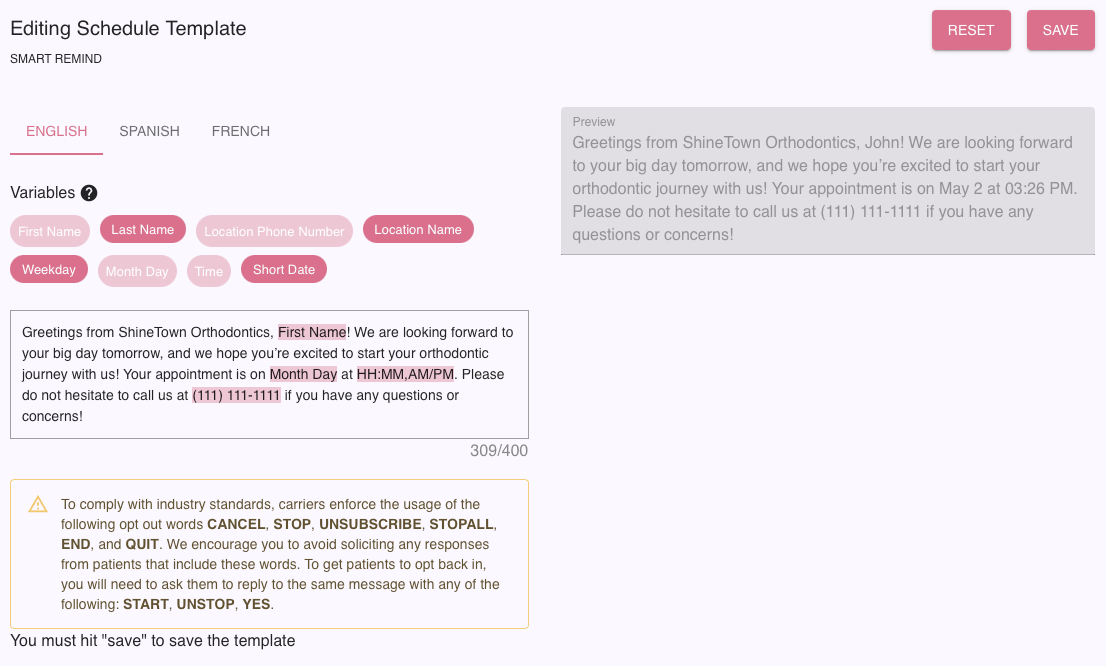 - Enter your reminder text. Add wording specific to the appointment type, such as "Don't forget to bring your retainers to your appointment!"