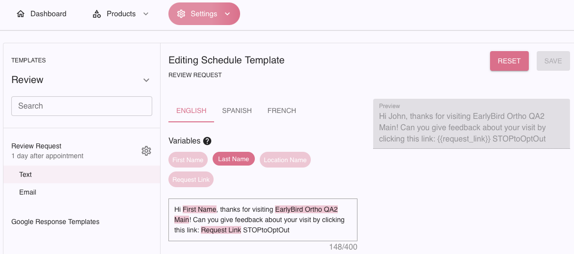 - Open up each preferred contact method to view the default template. Edit and customize to your liking. Note: Do not remove the pink Request Link variable; this is the link to your Google or Facebook review page.