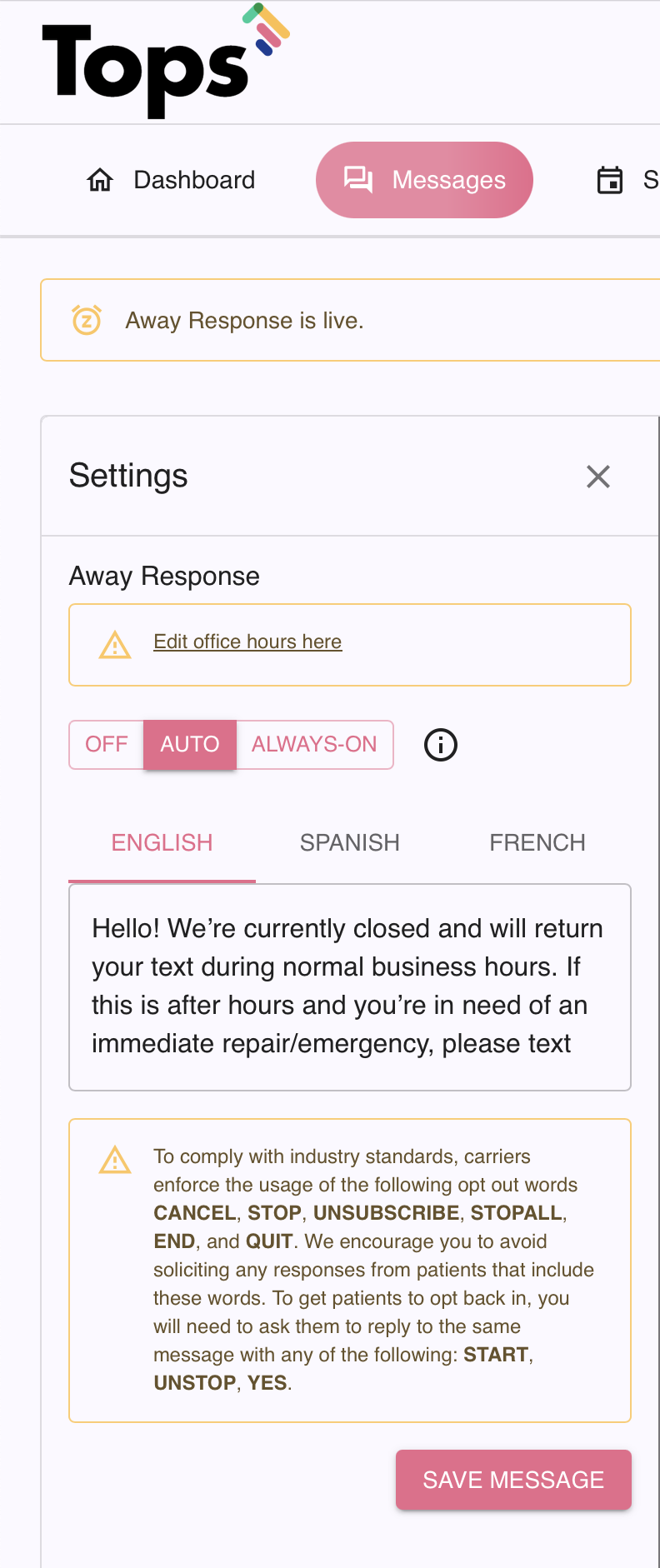 - Auto means that your Away Response will send when patients text outside of your office hours.