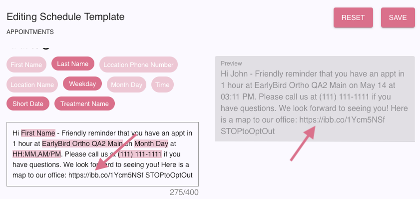 - Note: the image url will not show pink in the template - do not worry about that! It will show as an active link in the recipient's text thread.