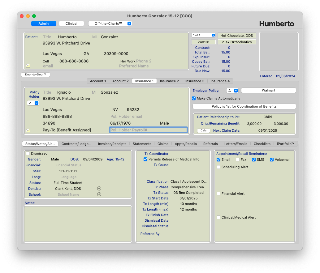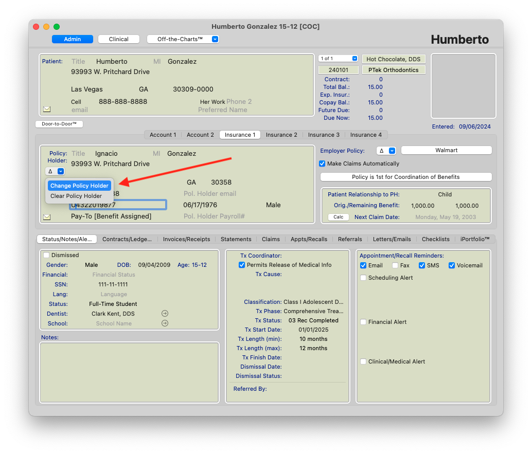 Our example patient, Humberto, has a Tops Ortho chart and was seen for treatment as a Phase I patient. His father, Ignacio, is entered as the policy holder in Insurance 1, and had a Cigna policy through his employer, Walmart. Humberto has been in Observation for the past couple of years, and now is ready for Phase II. During the re-verification of insurance, the insurance coordinator learns that the Cigna policy is no longer active. Ignacio indicates he has a new policy with Delta Dental at Walmart. What do you do?