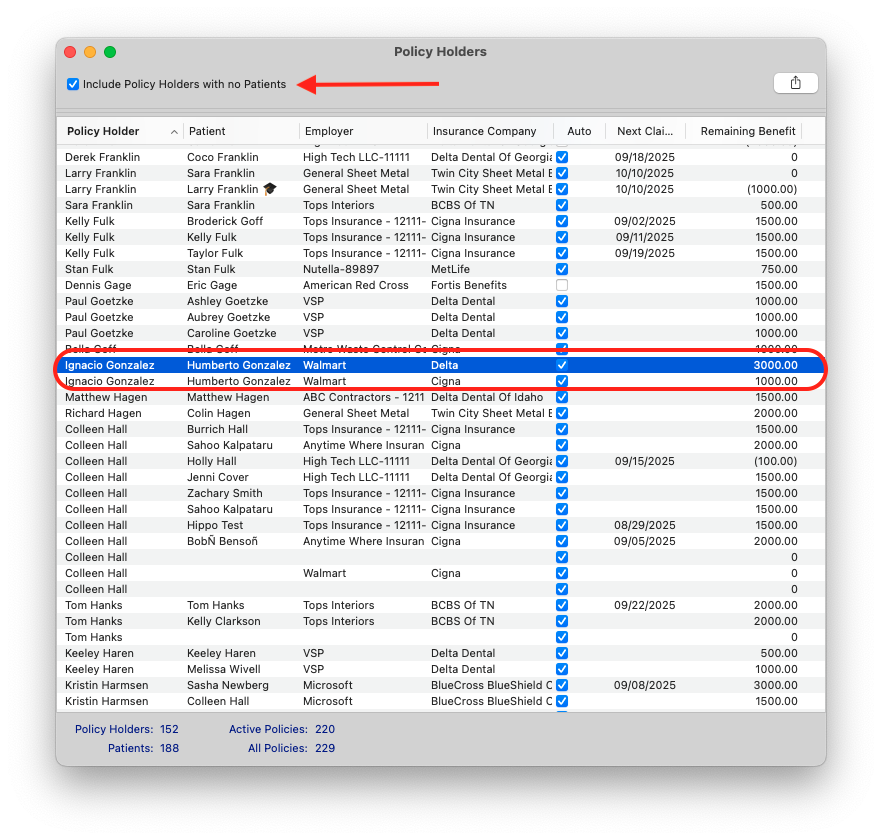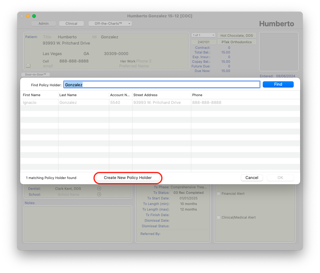 - Search for Ignacio's name. Do not select his existing policy holder record, as you are creating a new policy holder record. You want to create an entirely new Policy Holder record for Ignacio reflecting his new policy number unique to Delta Dental. You'll then attach the corresponding Employer policy.
