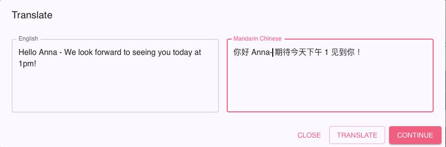 - Edit & Continue: You can edit the translation before sending. Click Continue to place the translated message into the outgoing text field.