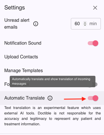 To update whether translations are automated or manual, click the gear ⚙️ next to messages and toggle on or off the Automated Translation feature.