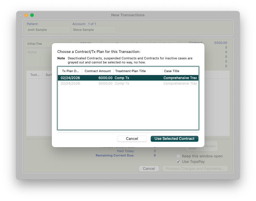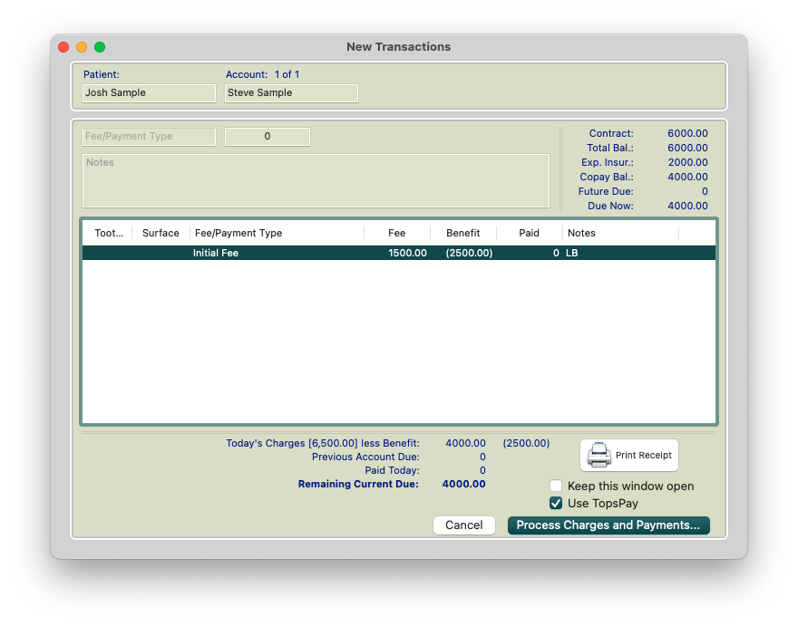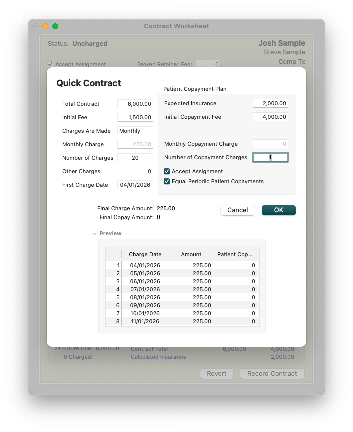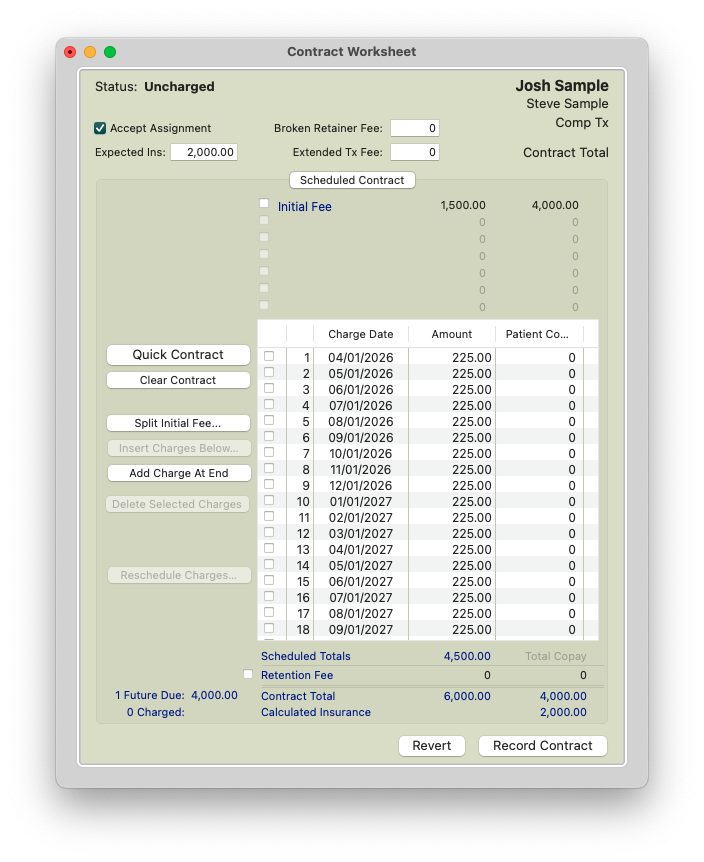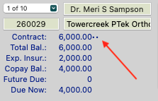 Using the example screenshot above, if the patient has a contract for $6000 but insurance is expected to pay $2000, the patient is responsible for the remaining $4000 as their copay amount. If the patient chooses to pay in full, the remaining $4000 of the contract can be charged out as the initial fee in the Copay column.
