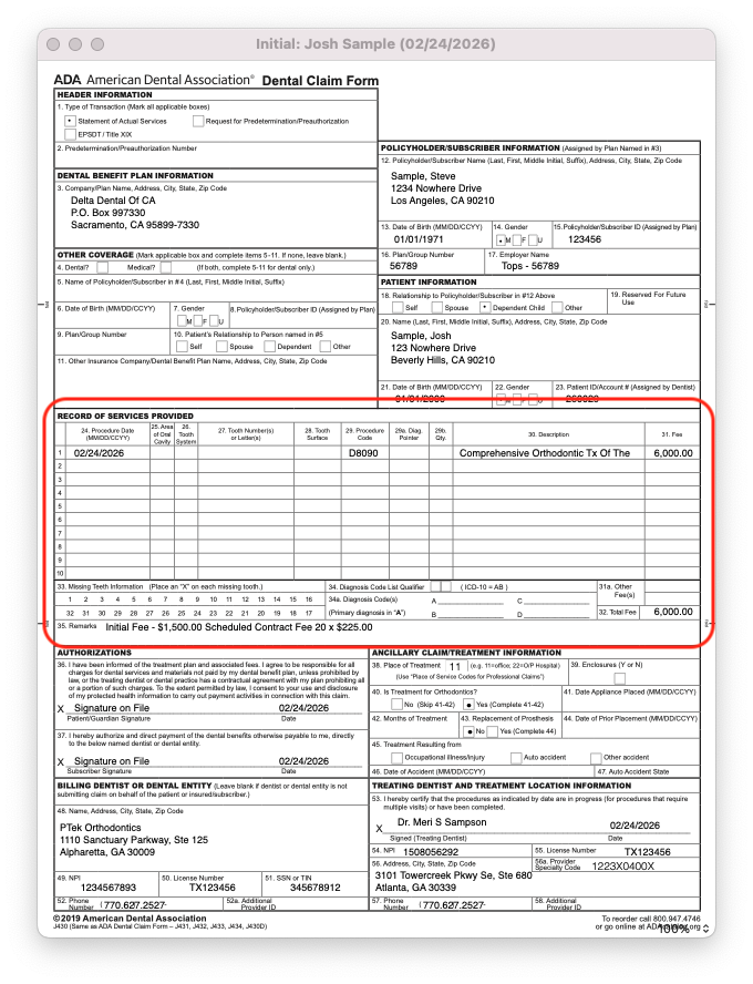- Initial Fee: The amount charged in the initial claim. This number is typically between 20-30% of the total treatment fee. In the example above, it is $1500 - 25% of $6000.