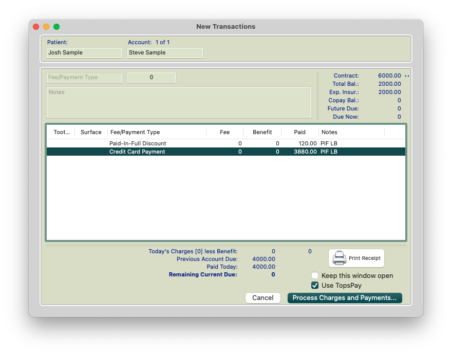 An office may offer to the patient a 3% discount if the patient pays in full. While the patient still owes the $4000 represented by the initial fee, the office allows the patient to pay $3880 which reflects the 3% courtesy off of the $4000. The office then should post a $120 (-) Account Adjustment for a Paid in Full discount. Between the patient's payment and the courtesy, the $4000 initial fee has now been paid.