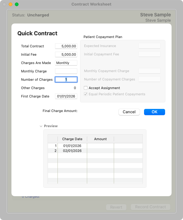 - Charges are Made: The frequency of the contract charges. This total should reflect 1 as there is only the initial fee that will be charged out to the patient.