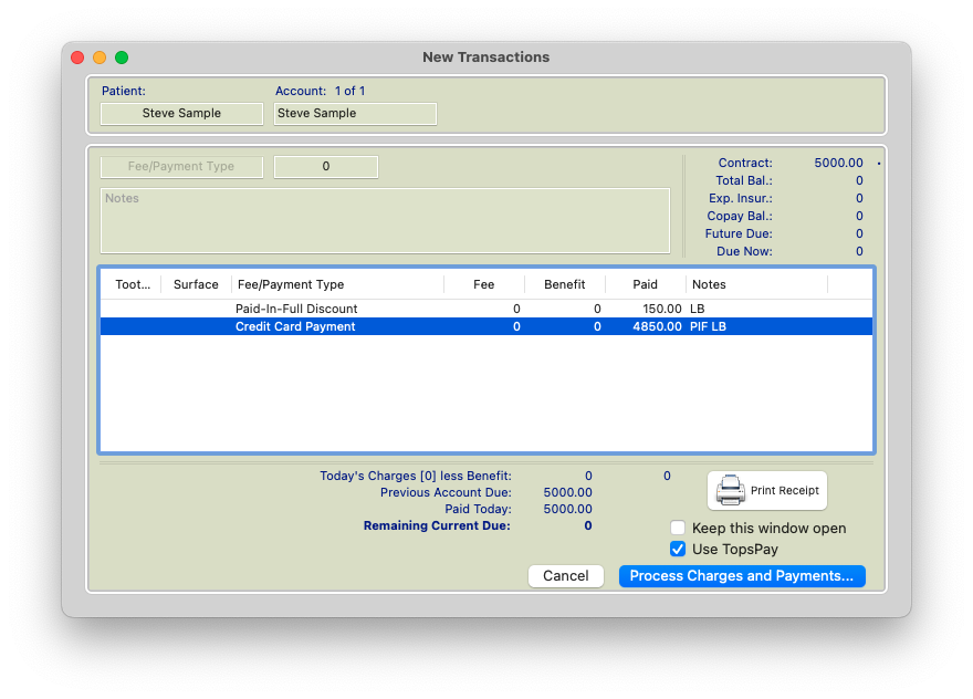 To enter the payment in discounts, you can continue to tab withini the same Transaction Window as the initial fee, or you can post them in a new transactions window. See below.