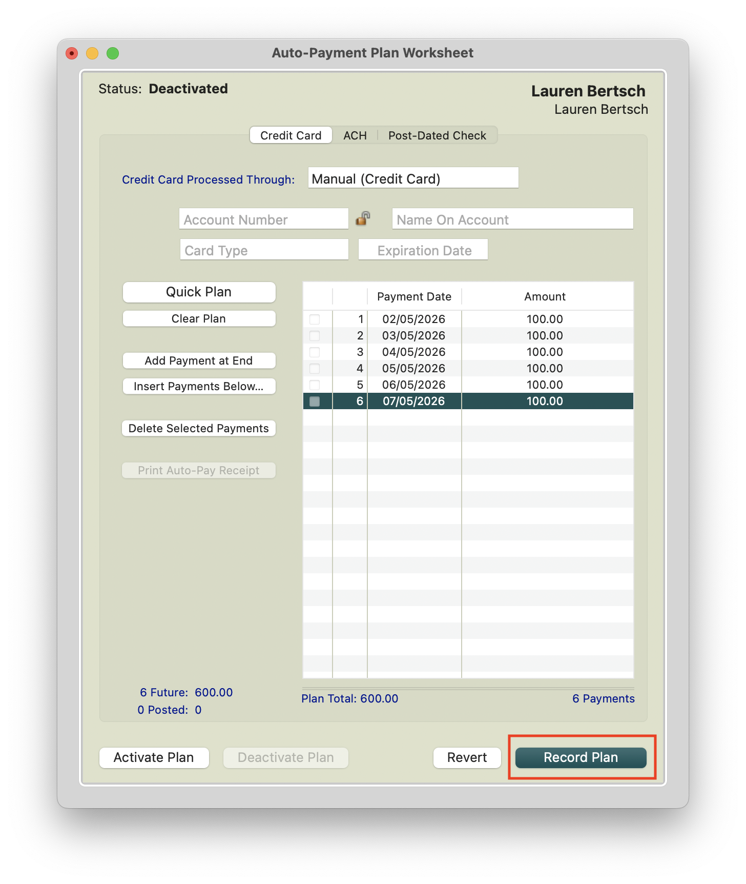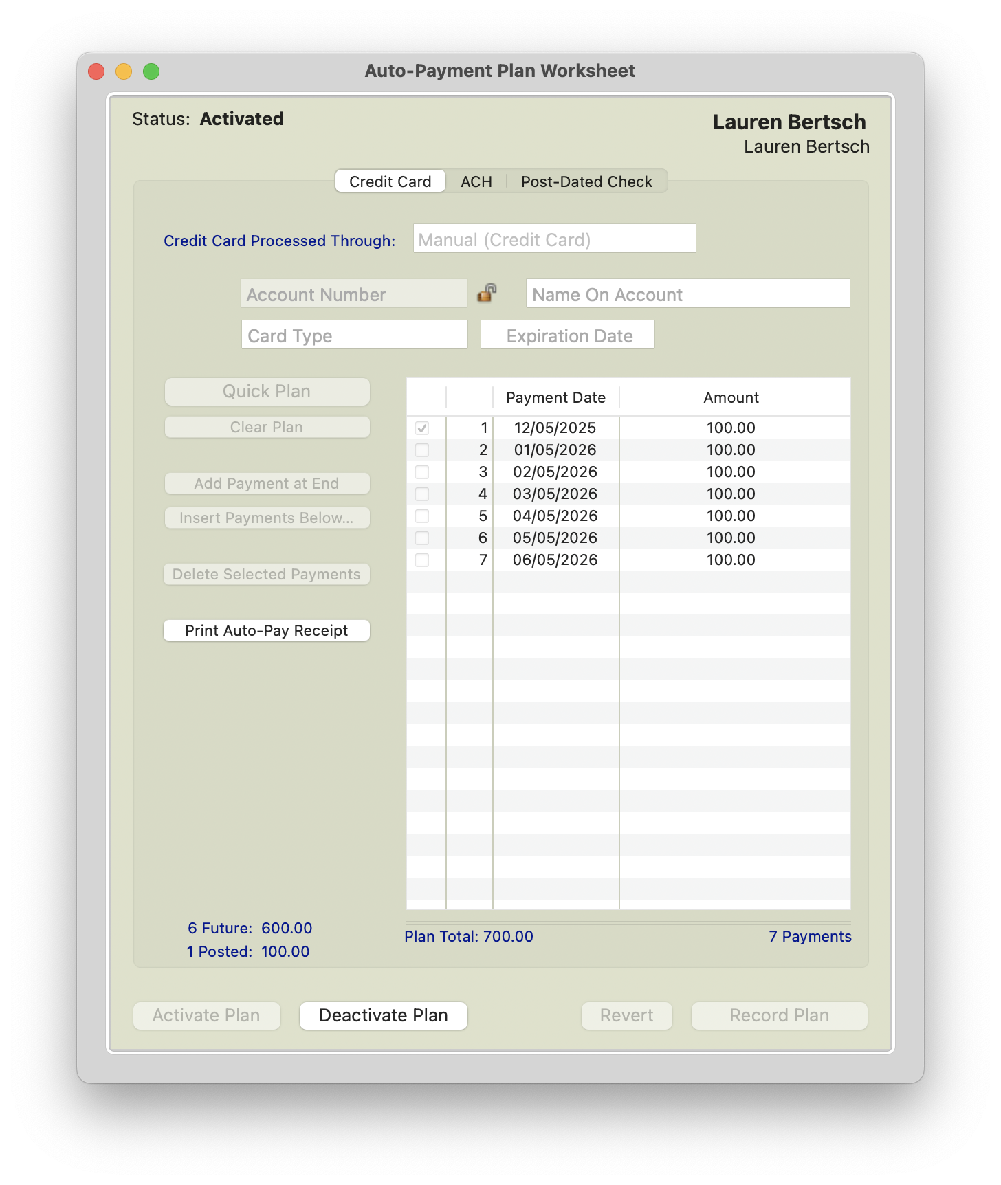 Once the plan has been deactivated, the Auto-Pay plan will reflect all payments that have not posted. Notice in the example below, the 12/5/2025 payment of $100 that shows as posted in Step 2 does not reflect in the deactivated auto-pay plan worksheet below.