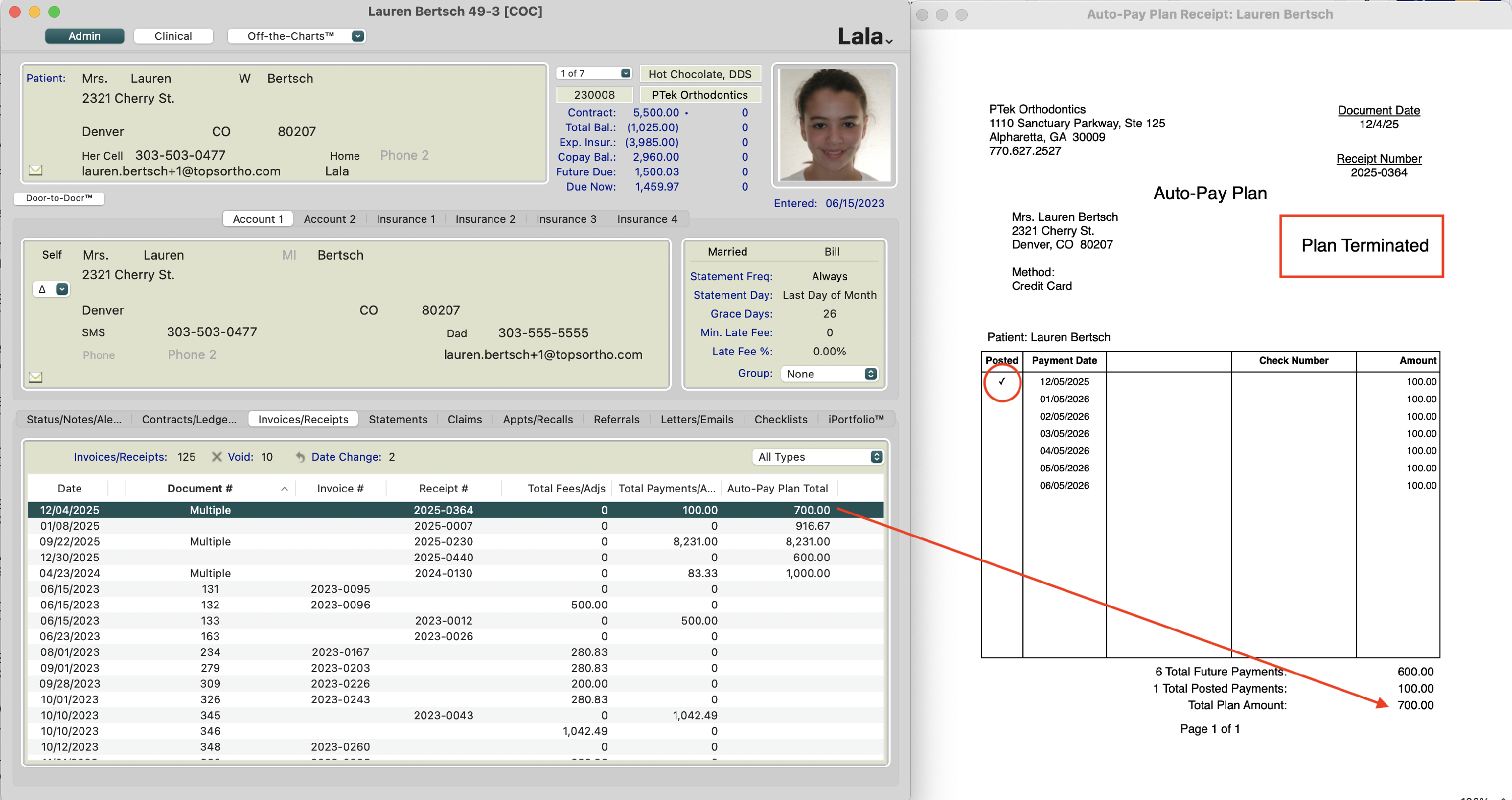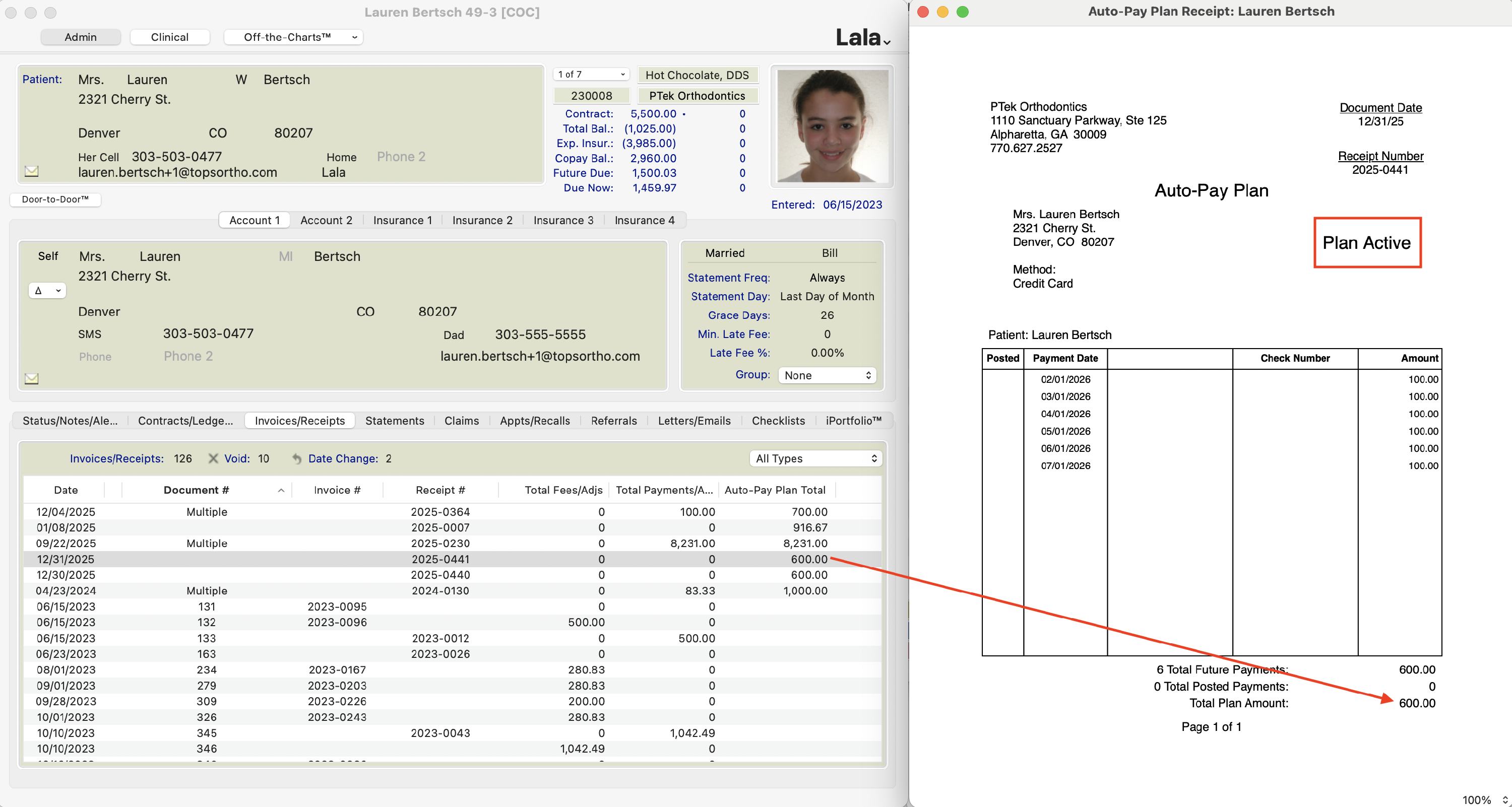 - The new plan will reflect in the patient's Invoices/Receipts tab. The date of the plan reflects the date the plan was activated.