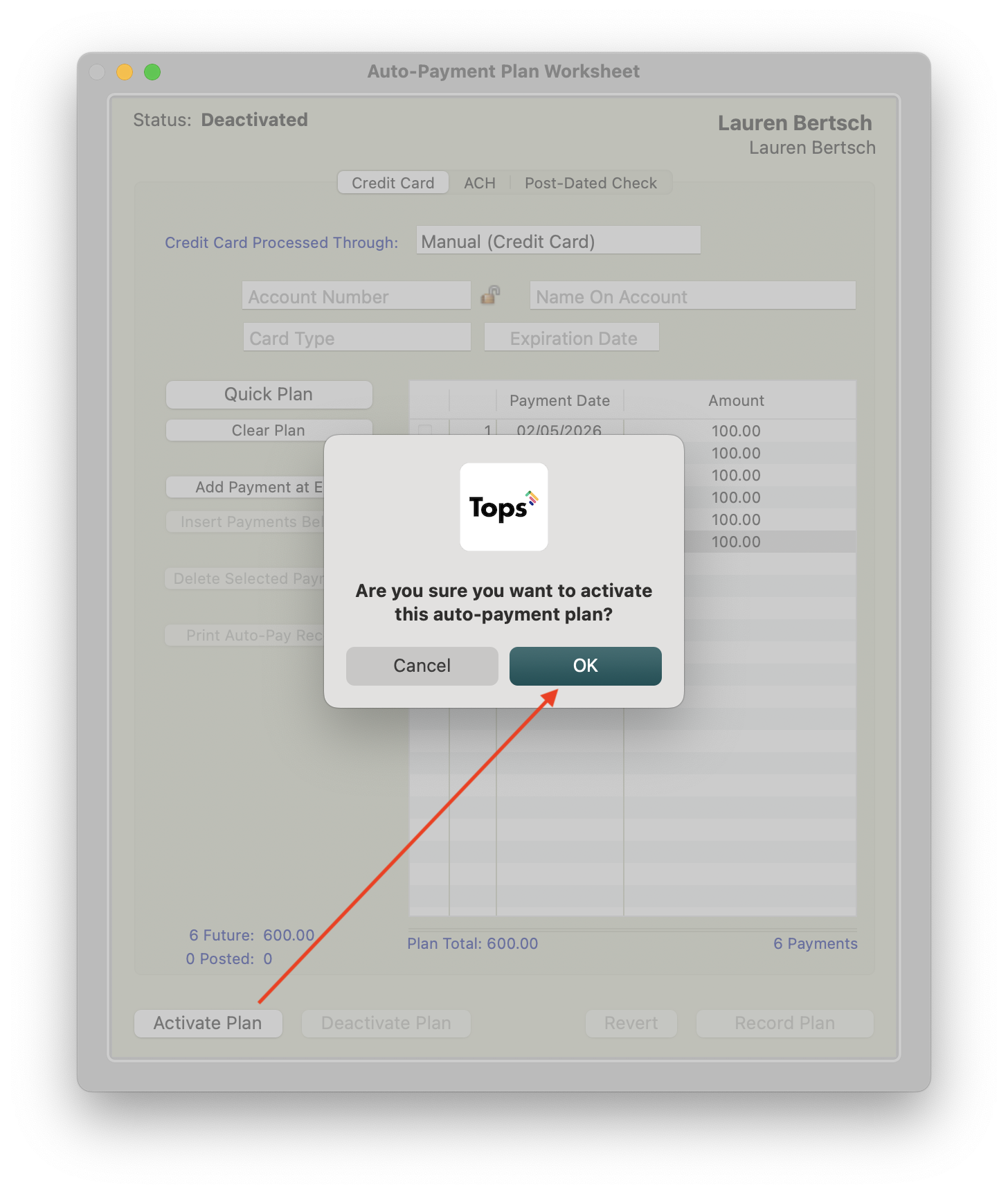 Click OK to acknowledge the Tops deactivation notification. Tops provides a notification that previously posted amounts will not appear on the copy of the deactivated auto-pay plan worksheet.