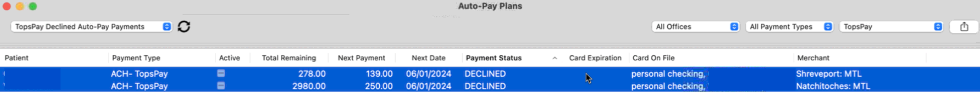 From Matrix>Auto-Pay Plans, the failed ACH charge will also appear on the TopsPay Decline report: