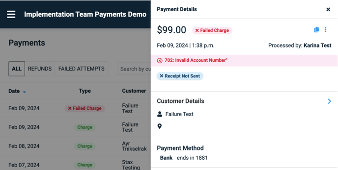 The image below represents what it will look like when a bank payment fails these initial validations. Notice the red “Failed Charge” bubble and the red error message “702: Invalid Account Number.”